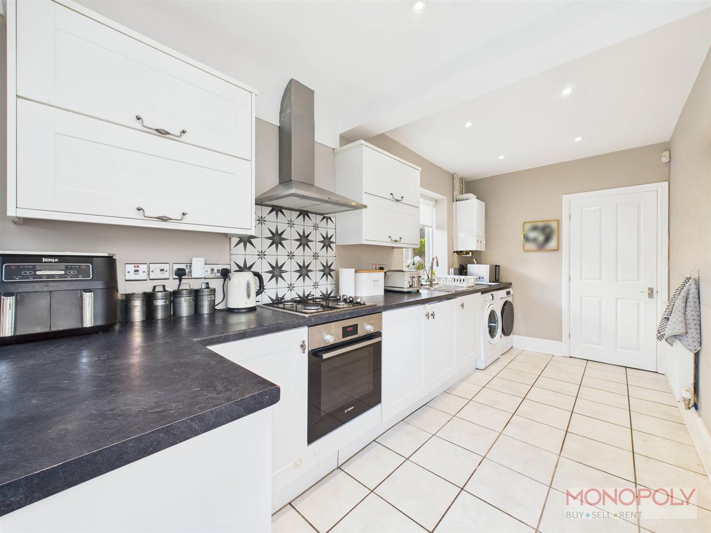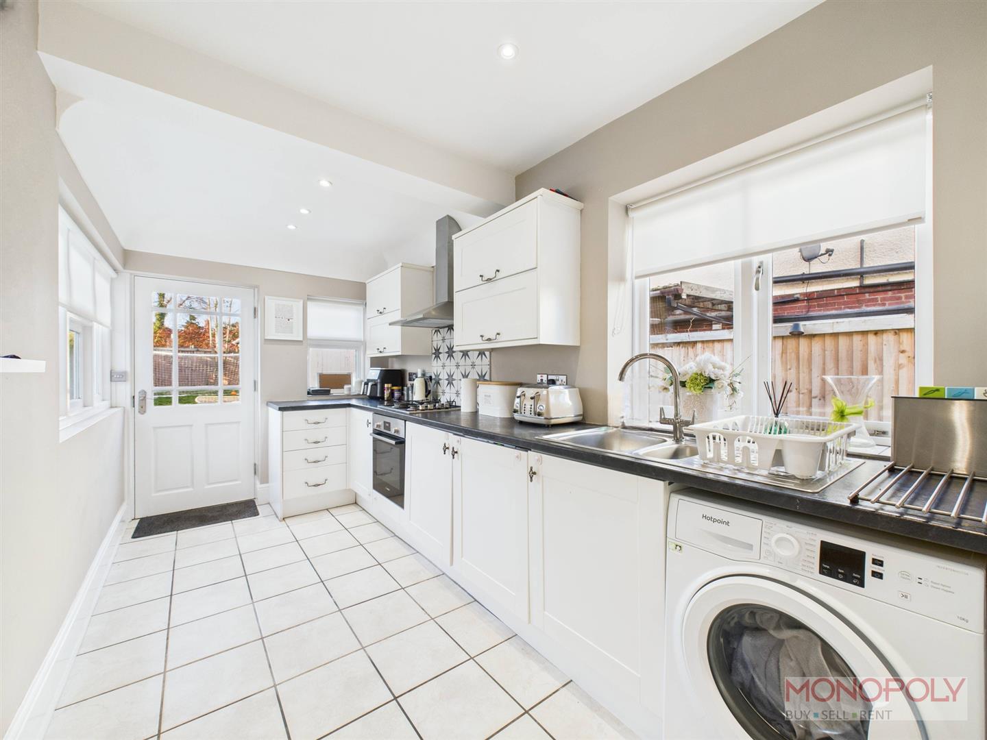 Housing a range of wall, drawer and base units with complimentary work surface over. Integrated appliances to include under-counter fridge, freezer, electric oven, gas hob, tiled splash back and extractor above. Space for washing machine and tumble dryer. 1.5 stainless steel sink unit with mixer tap above. Wall mounted combination boiler, tiled flooring, recessed LED lighting, panelled radiator, three double glazed wooden windows to the side, rear and a composite door to the rear garden.