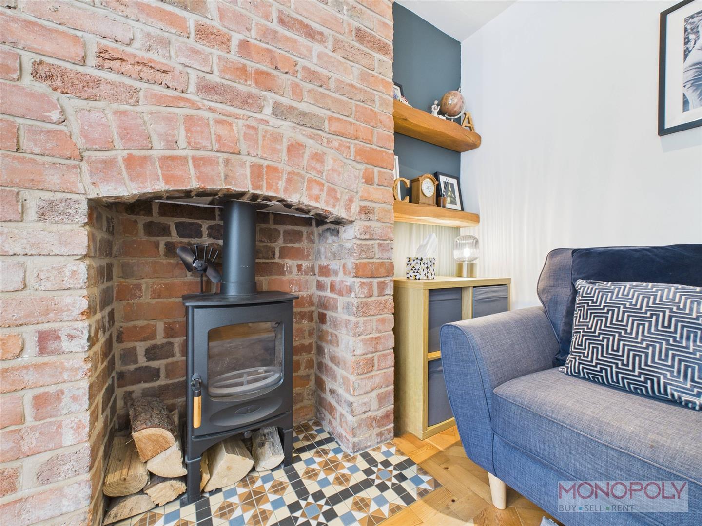 Wooden double glazed bay window to the front elevation. Log burner set on a patterned tiled hearth and brick surround. Original parquet flooring, recessed LED lighting and panelled radiator.