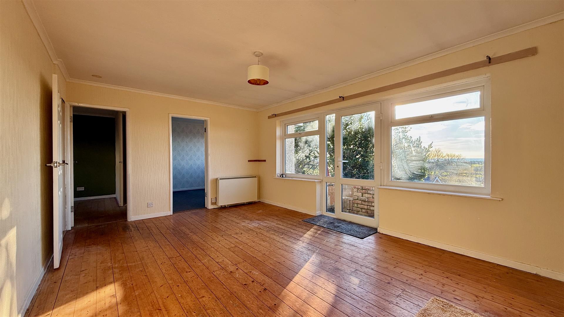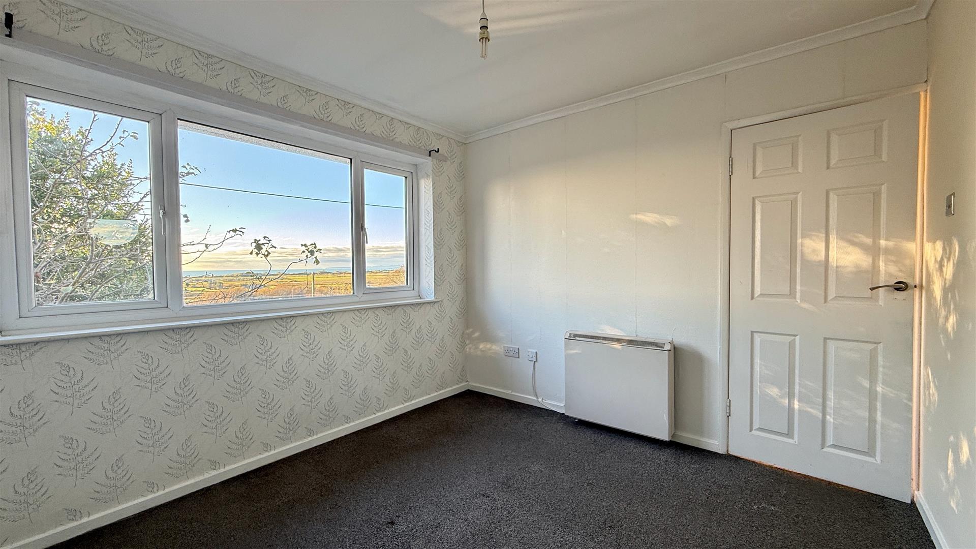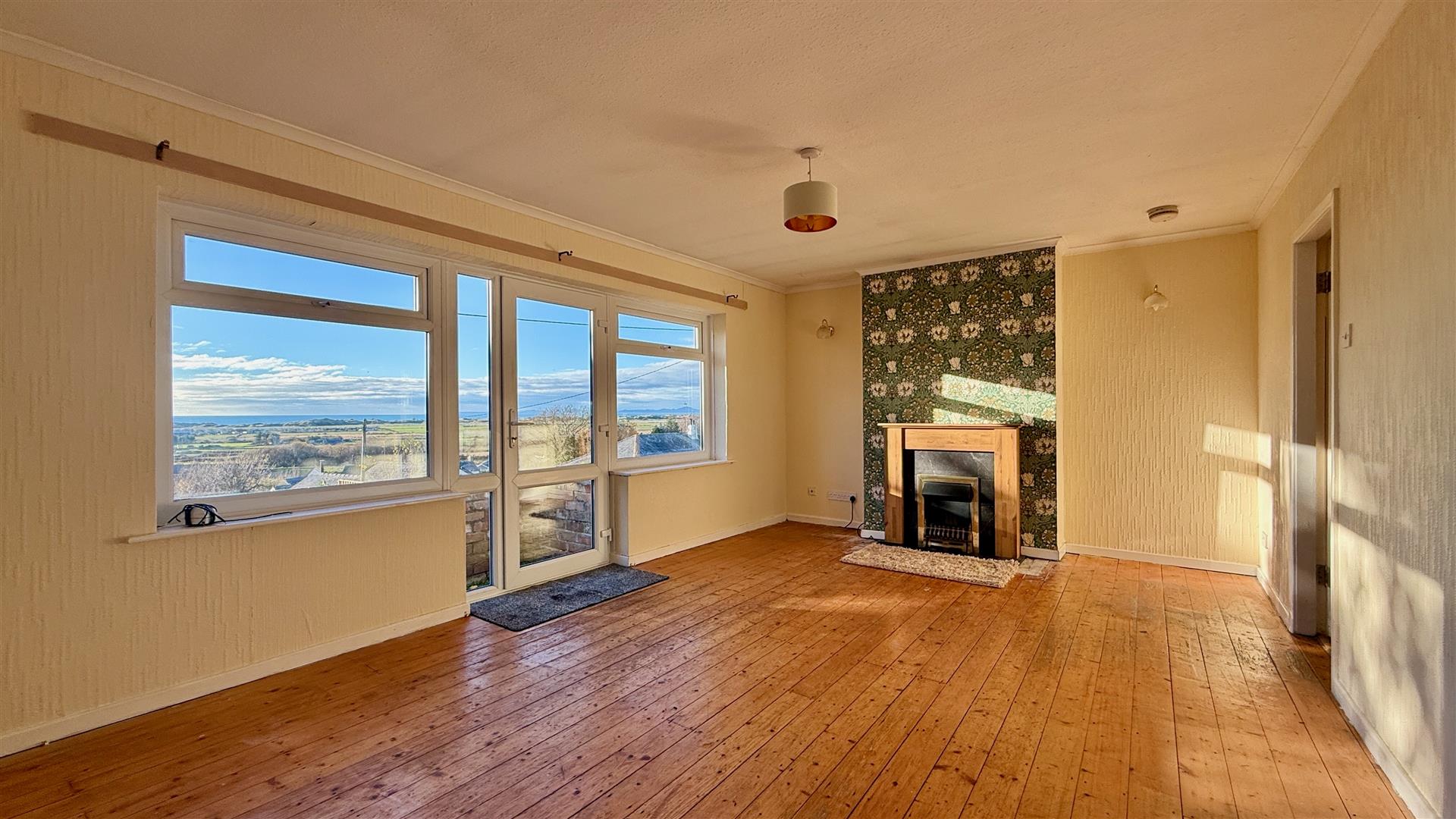 This spacious light and airy room benefits from expansive sea views and a French door opening to steps leading to the garden. There are exposed wooden floorboards and a feature fireplace with electric fire. Previously housing a log burner and new owners could install if required.
