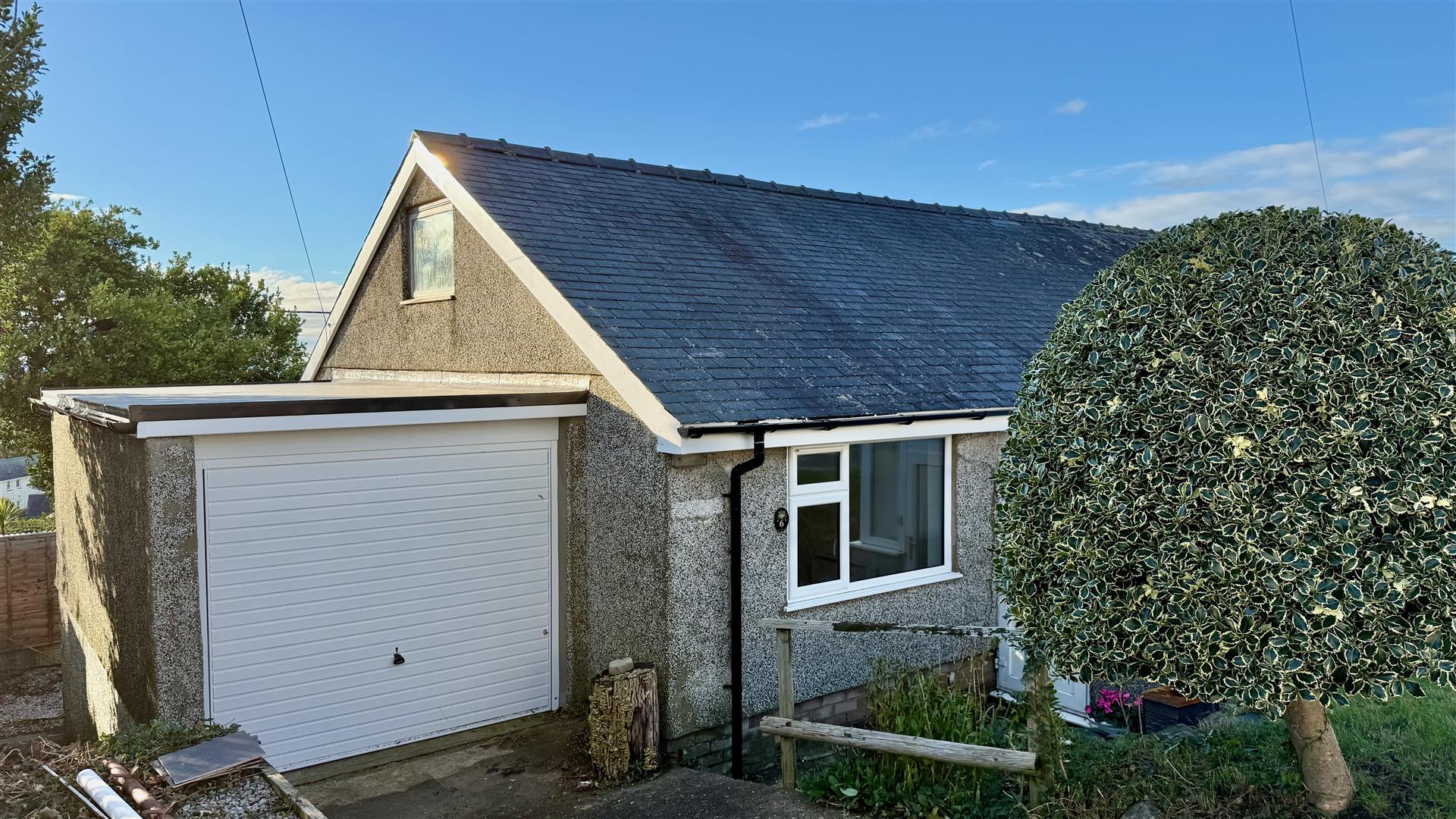 To the front is a small lawn and rockery garden and steepish driveway to the garage. The garden continues around the side and opens to a sunny rear garden, low maintenance laid to lawn with expansive sea views and steps leading up to the French door to the lounge/diner.