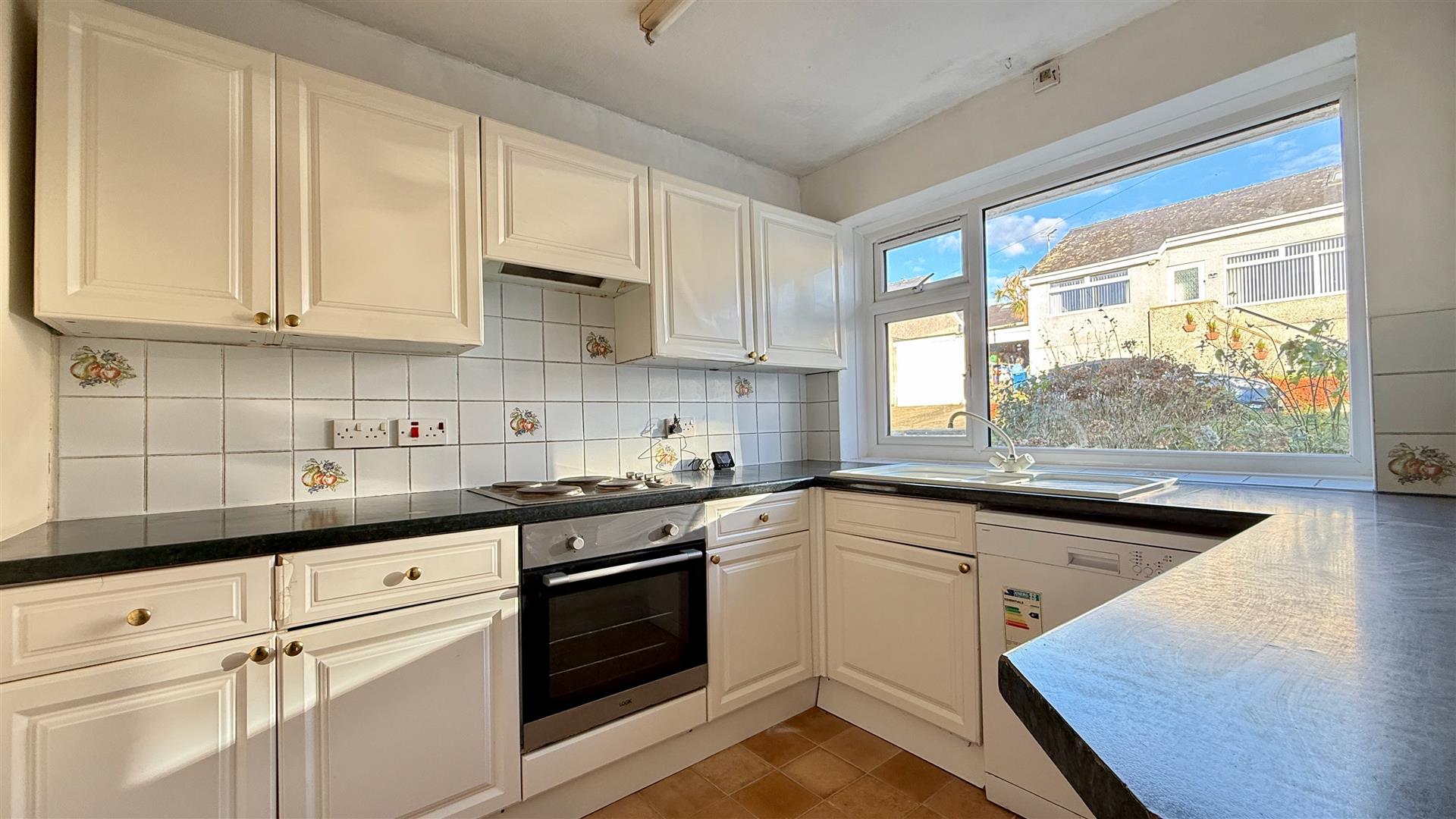With a range of wall and base units and window to the front. Built in oven and hob, dishwasher and space for fridge.