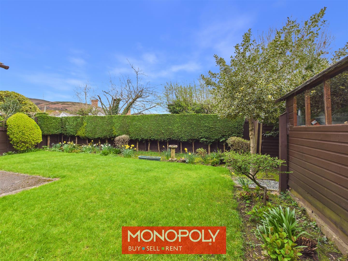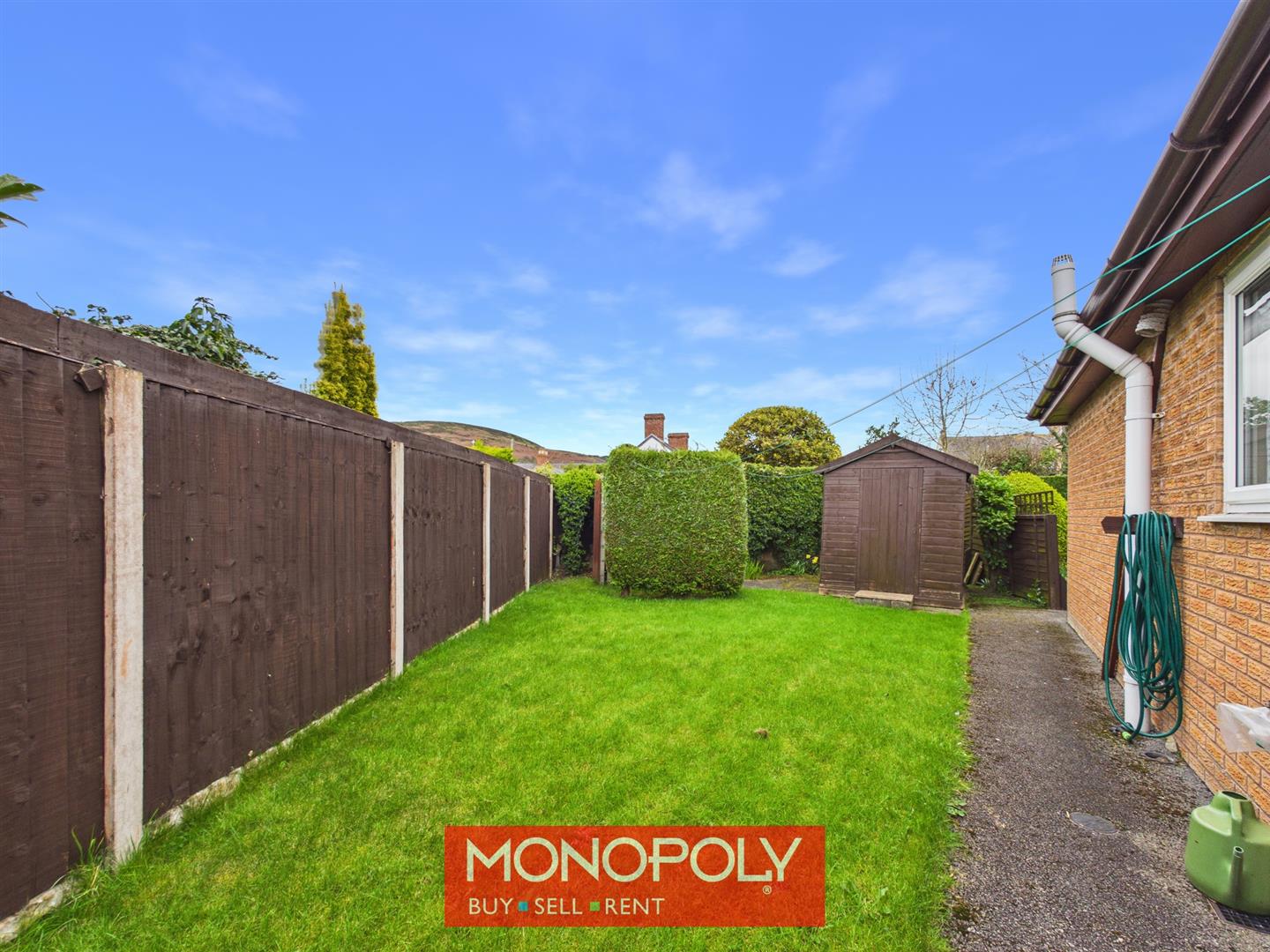 To the side of the property, there is a lawned garden with a timber potting shed, outdoor tap and washing line, together with an oil tank screened by mature hedging. Timber gates lead through to the front and rear garden, and the space enjoys a pleasant outlook towards the Clwydian Range and Moel y Parc.