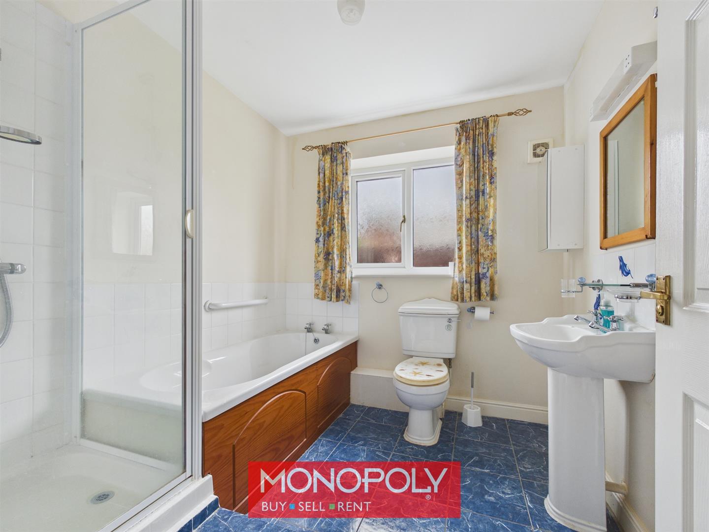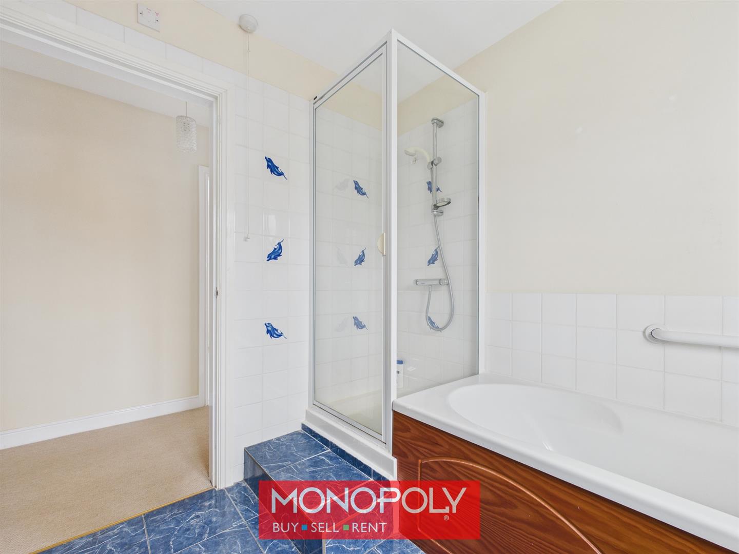 Fitted with a four-piece suite comprising a bath with a hand rail, pedestal wash hand basin, WC and corner shower enclosure with thermostatic shower. Finished with tiled flooring, decorative splashbacks, radiator, wall cabinet, mirror, extractor fan and a privacy-glazed window.