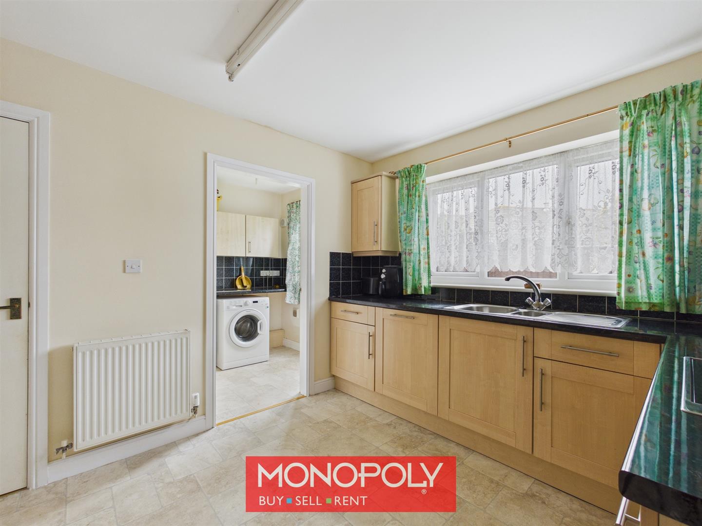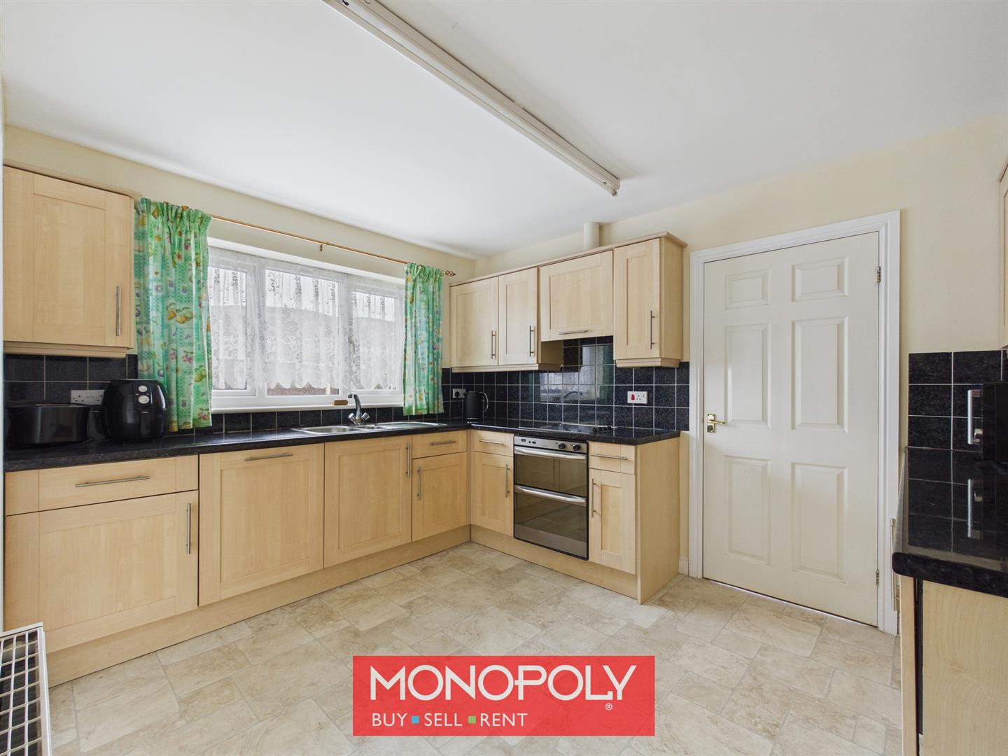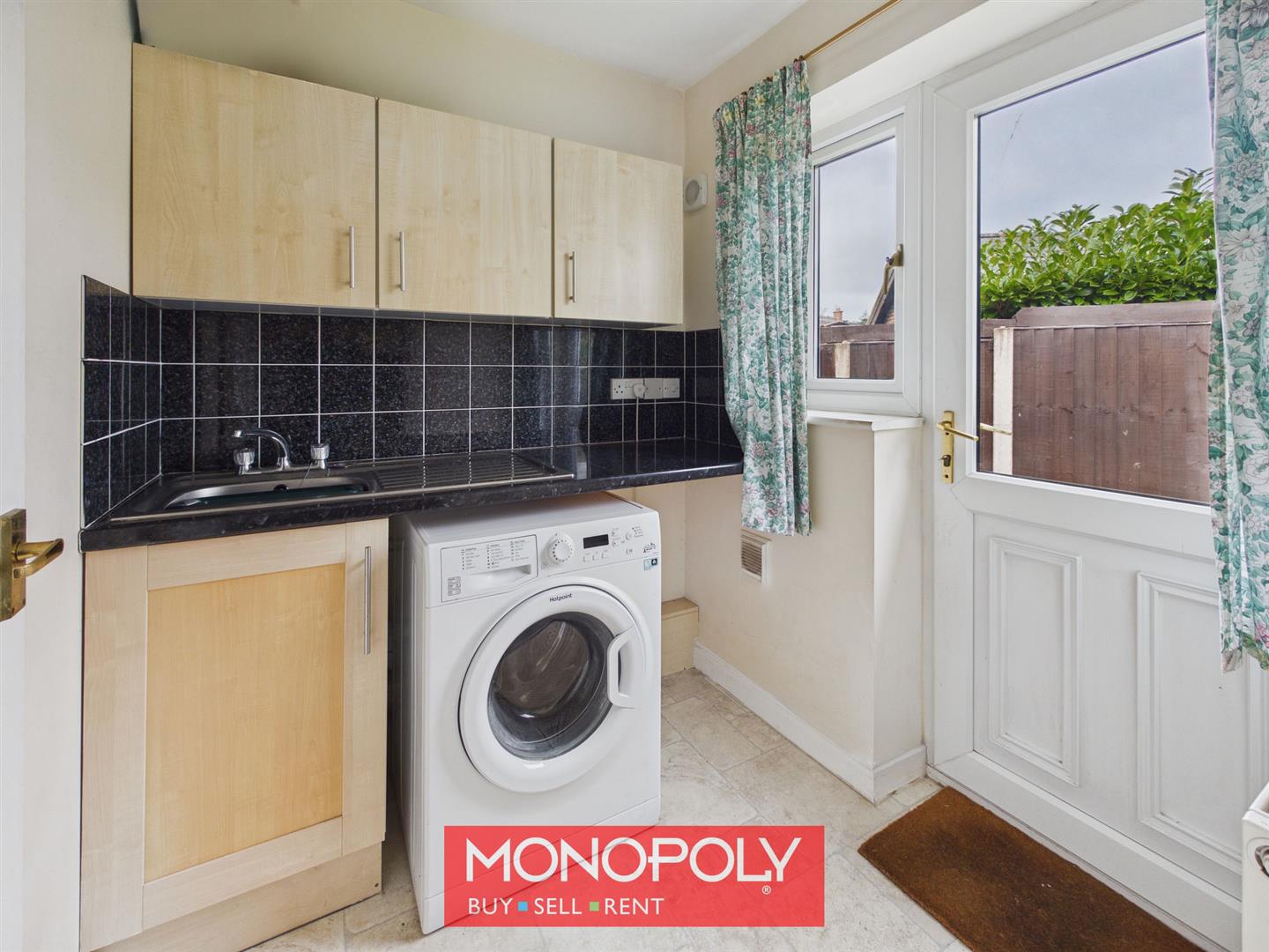 The utility room follows the same style as the kitchen, with matching units, worktops and tiled splashbacks, together with space for both a washing machine and tumble dryer. An external door with adjoining window provides direct access outside.