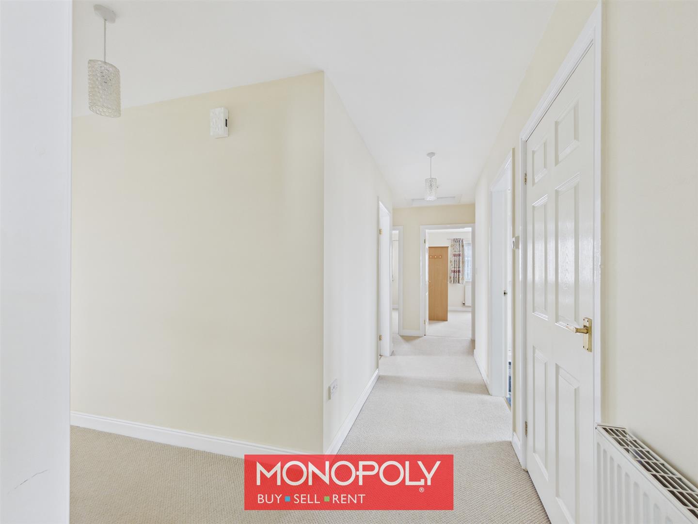 An L-shaped hallway that provides access to the majority of the rooms and offers a practical, central flow through the home. Finished with carpeting, it also benefits from a cloaks cupboard, airing cupboard, radiator, and a hatch gives access to the loft.