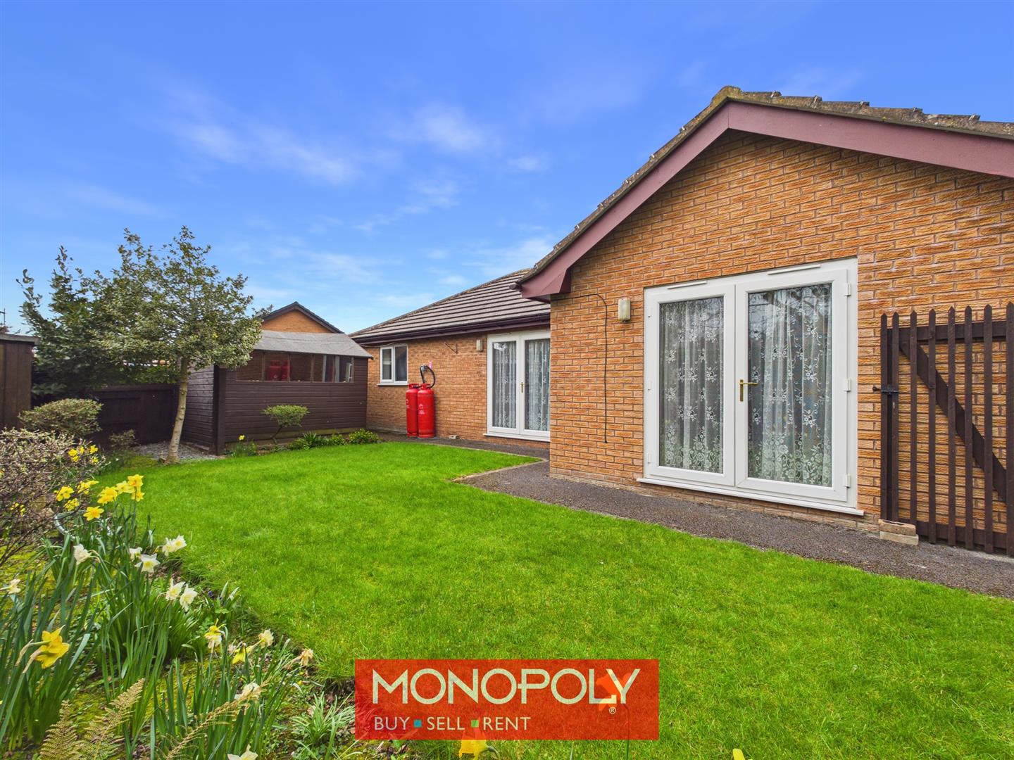 To the opposite side of the bungalow is a further useful outdoor area with lawn, pathway, timber storage shed and gated access to the front, all enclosed by panel fencing.