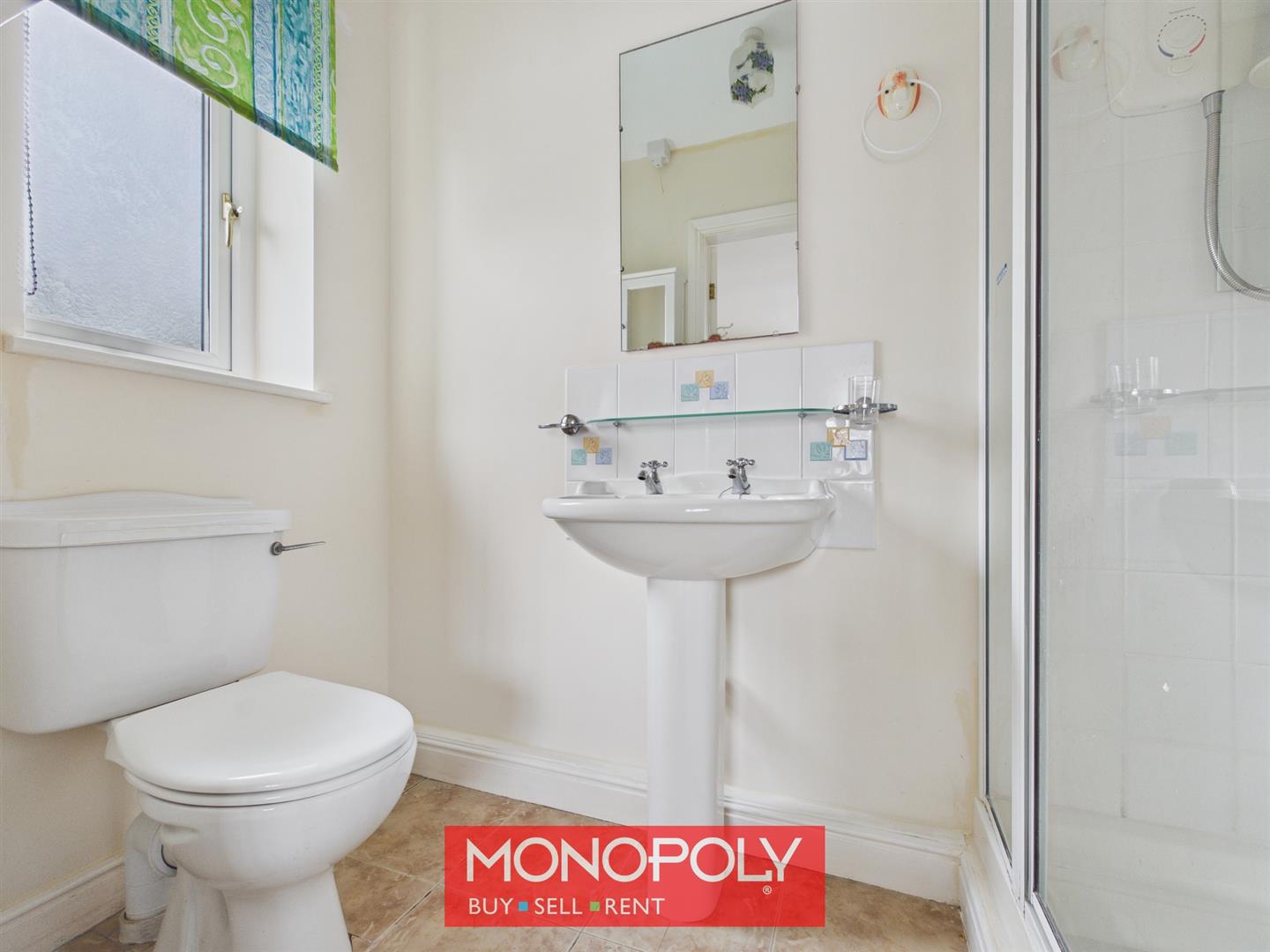 Fitted with a three-piece suite comprising a WC, pedestal wash hand basin and enclosed shower cubicle with electric shower. The room also includes tiled flooring, tiled splashbacks, a wall-mounted cabinet, radiator and a UPVC privacy window.