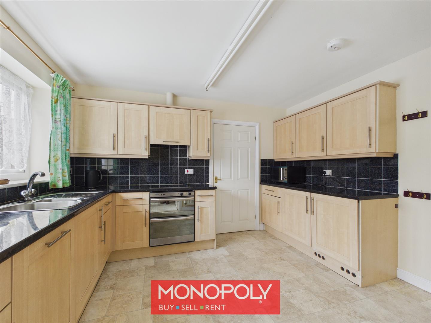 Fitted with a range of pine-effect units complemented by black granite-effect worktops and tiled splashbacks. It includes an electric oven, induction hob with extractor above, integrated dishwasher, under-counter fridge and freezer, and provides convenient access through to both the utility room and dining room.