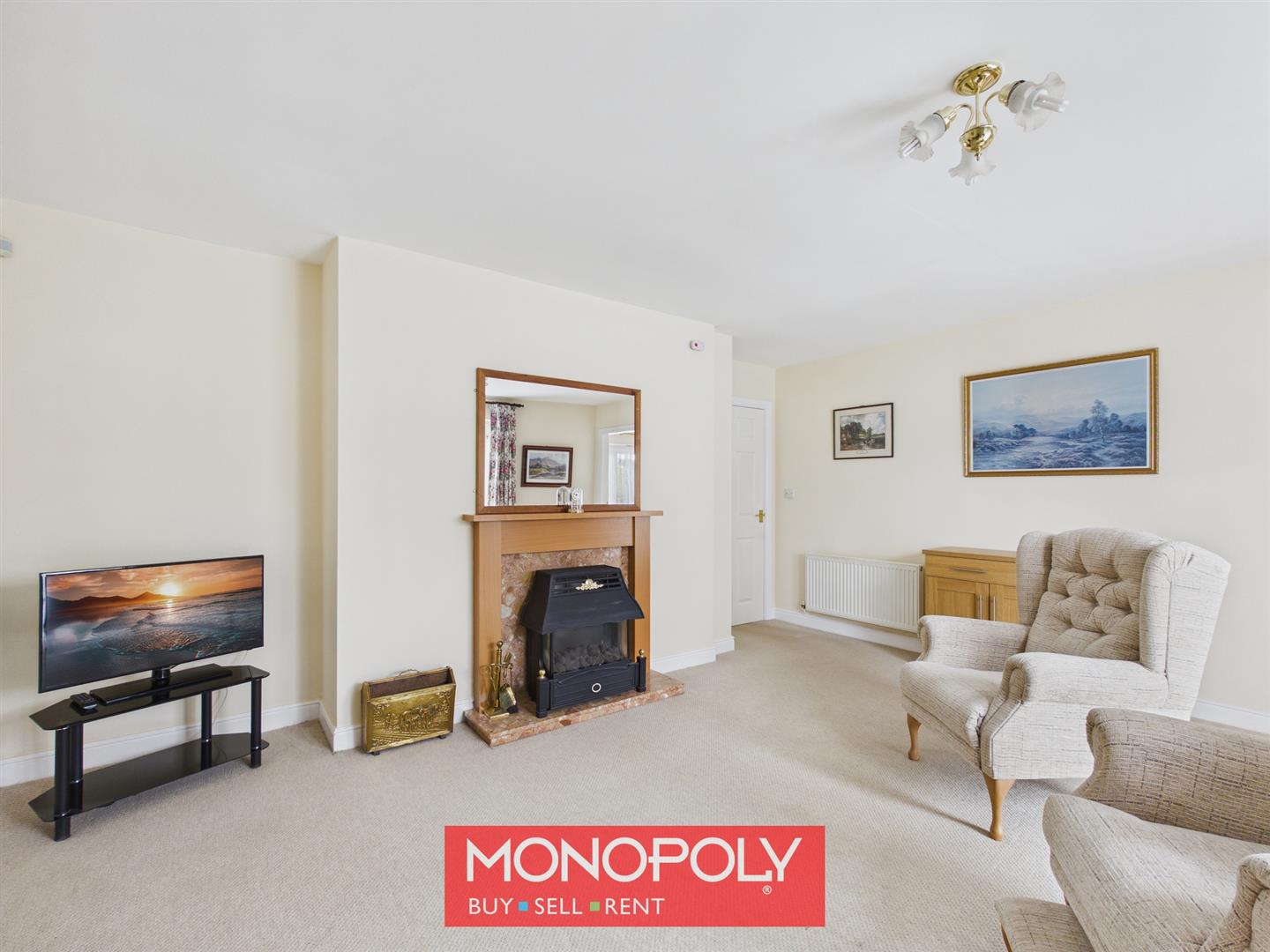 A spacious and comfortable living room centred around a marble fireplace with hearth and wooden mantel housing a gas fire, creating an attractive focal point with carpeted flooring, radiators and patio doors open directly onto the rear garden, bringing in plenty of natural light.