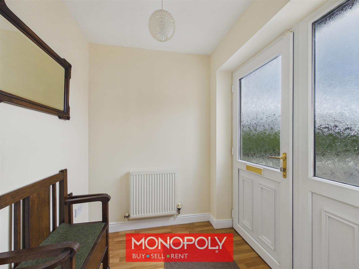 A welcoming entrance space fitted with wood-effect vinyl flooring and a radiator, with an attractive front door and side panel allowing in natural light. A glazed internal door opens through to the main hallway.