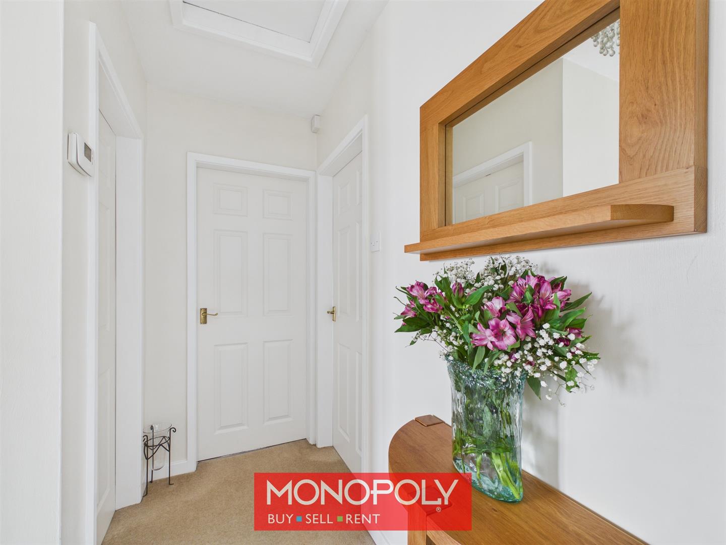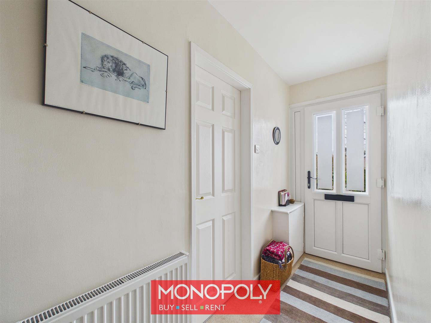 A carpeted entrance hallway accessed via a uPVC front door with two frosted glass panels. The hallway provides access to the lounge, kitchen diner, bathroom and both bedrooms.
