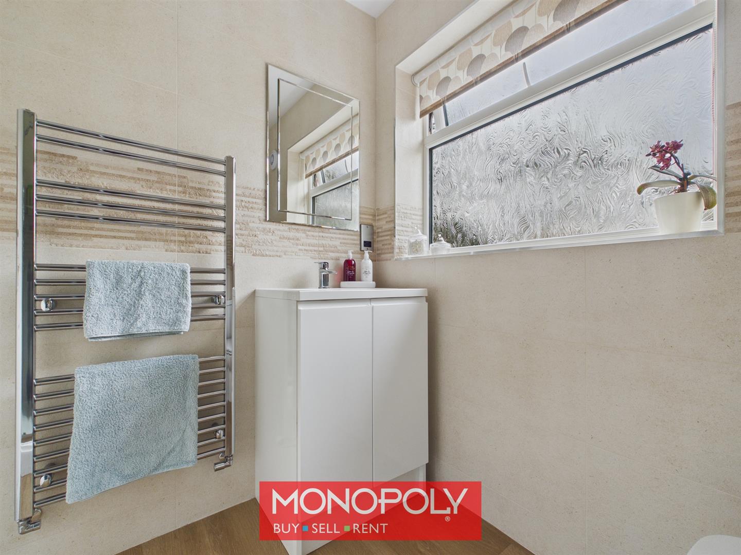 A contemporary bathroom finished with wood-effect laminate flooring, tiled walls and panelled ceiling with downlights. Comprising a waterfall shower with curved glass enclosure and tray, WC, hand basin with storage beneath, chrome heated towel rail and shaver socket. An obscure double glazed window to the rear provides natural light and privacy.
