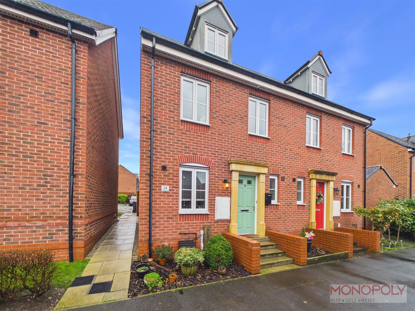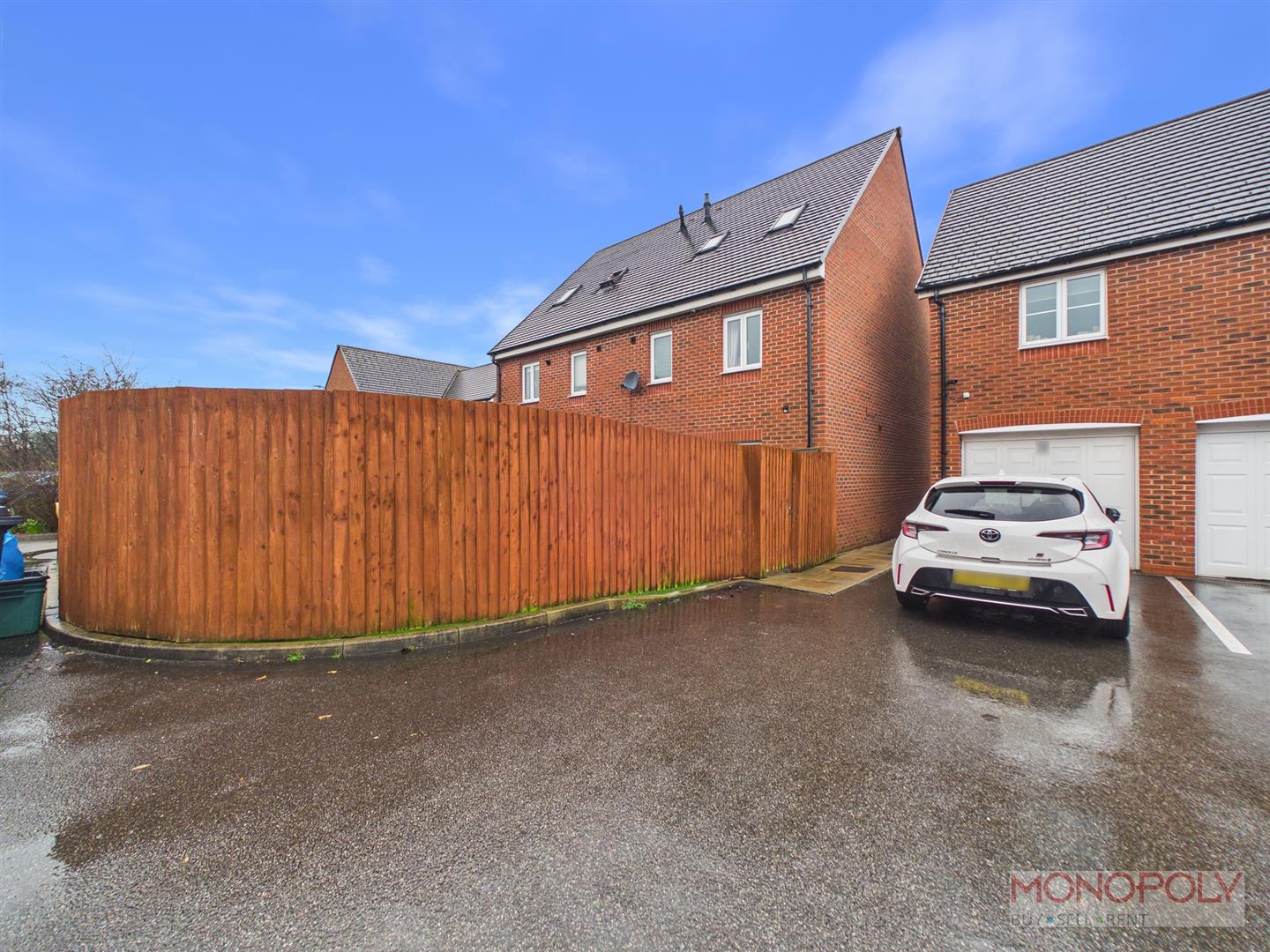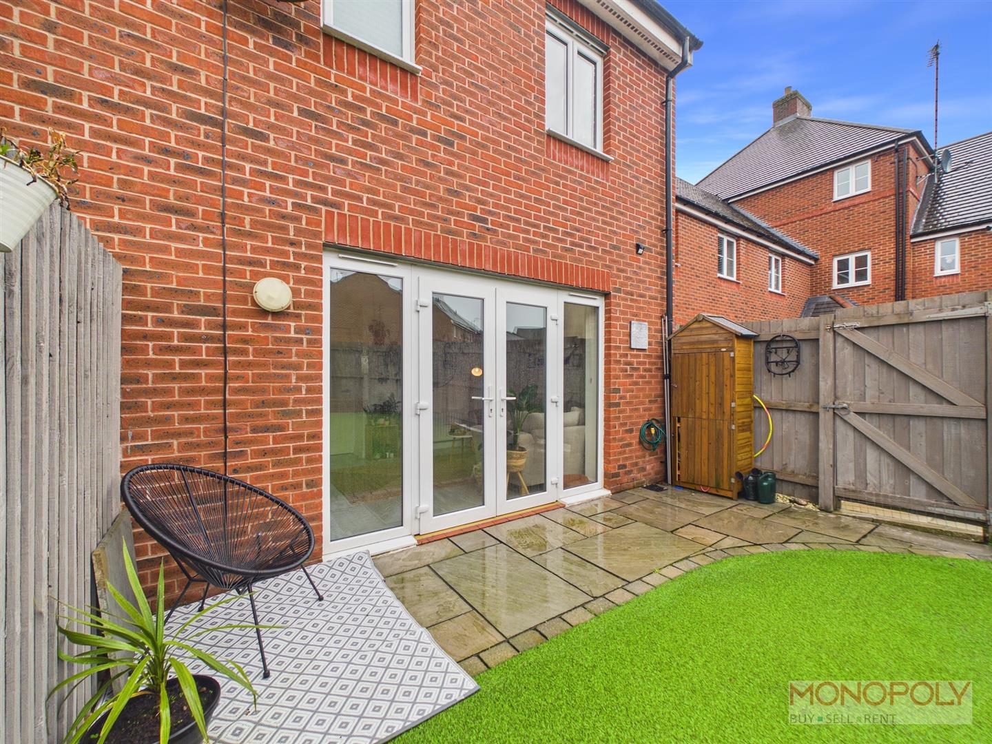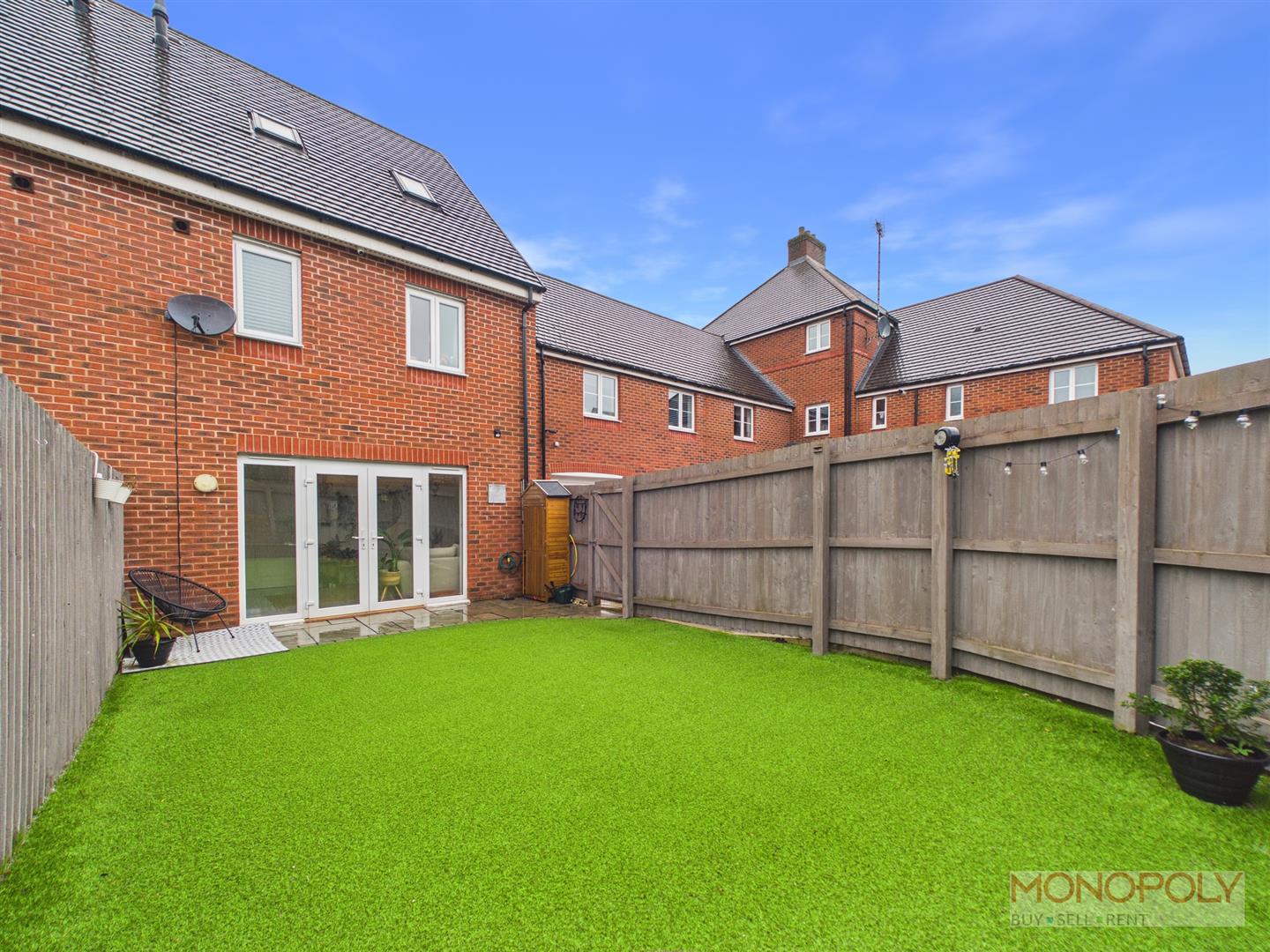 The ground floor welcomes you with a generous entrance hallway which leads to a contemporary kitchen with space for dining and a bright living room with French doors opening onto the rear patio. The first floor provides two well-proportioned bedrooms and a stylish three-piece family bathroom, while the impressive top floor principal suite benefits from built-in wardrobes, a skylight, and a modern en-suite shower room. Externally, the property features a low-maintenance rear garden with artificial lawn and patio area, an outdoor tap, side access gate, and an allocated parking space to the rear. The property benefits from a garage which is leasehold. To the front is a a paved walkway and steps leading to the front entrance.
