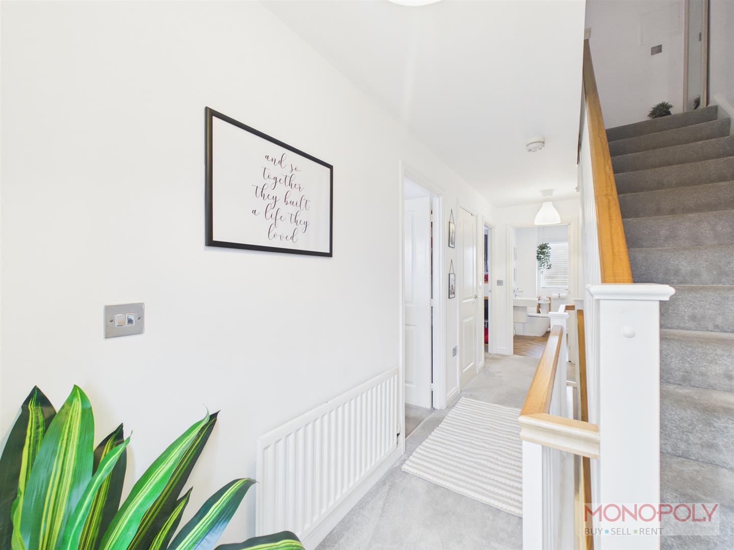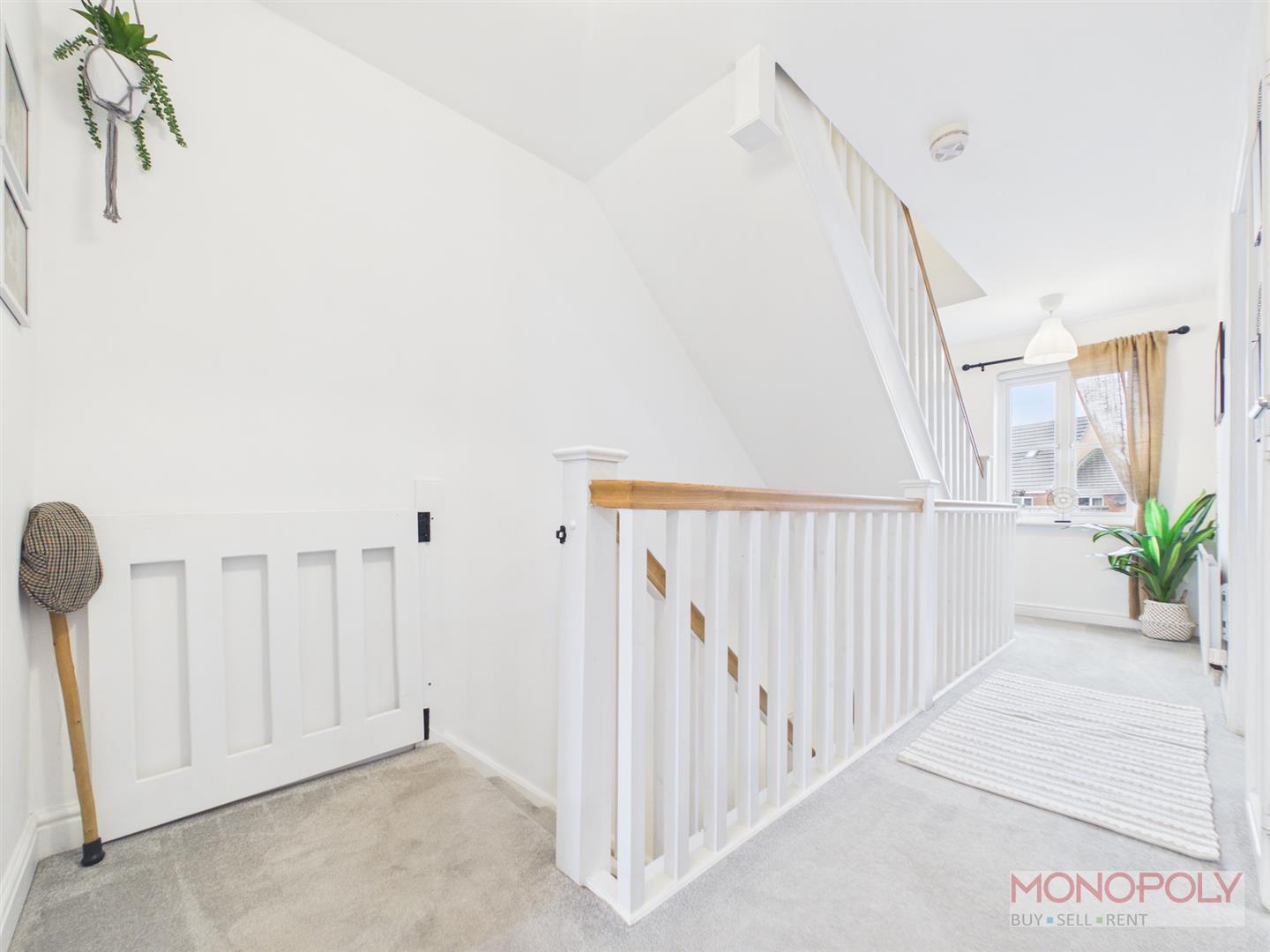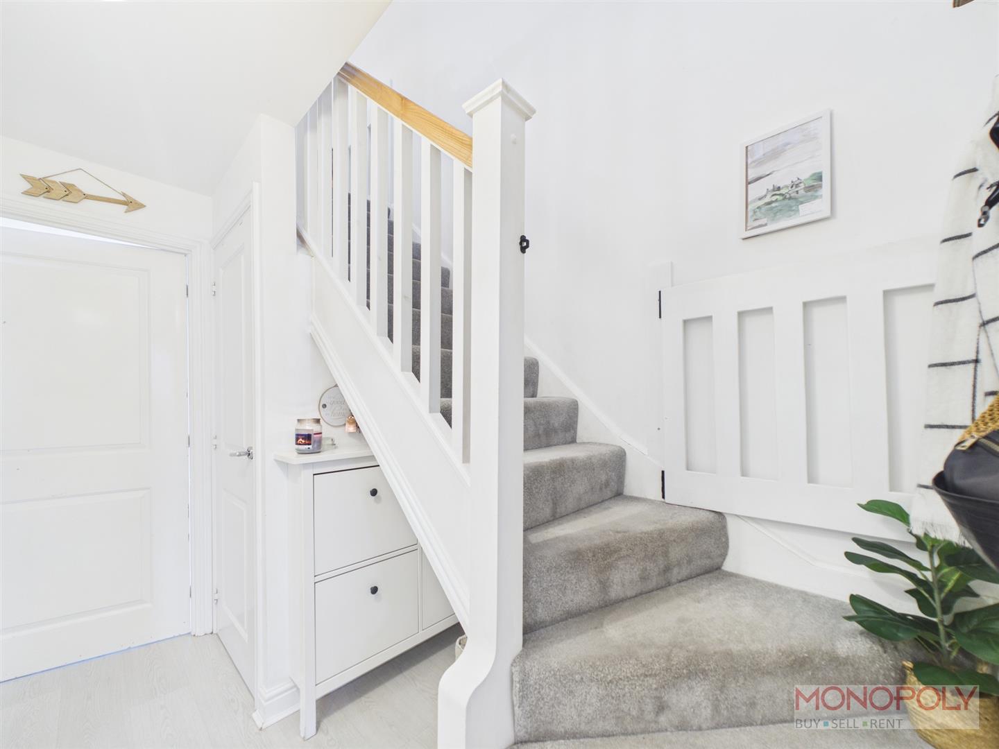 Welcoming entrance hallway with ceiling light points, radiator, doors into the living room and downstairs w.c., opening into the kitchen, stairs rising to the first floor and storage cupboard with and extractor fan and plumbing for a washing machine.