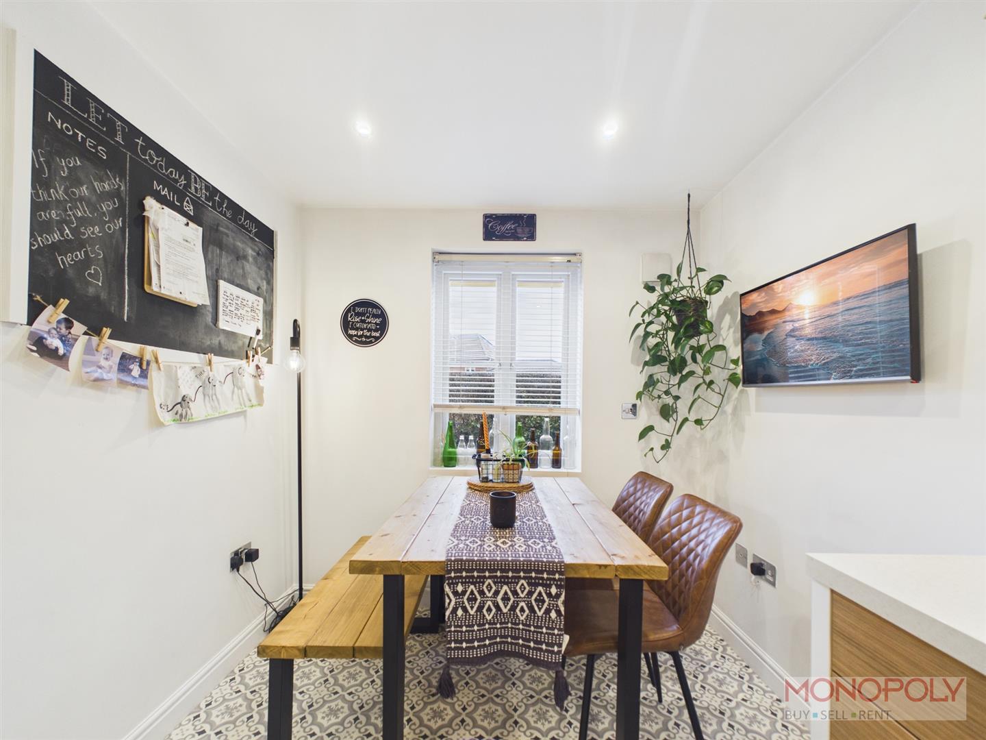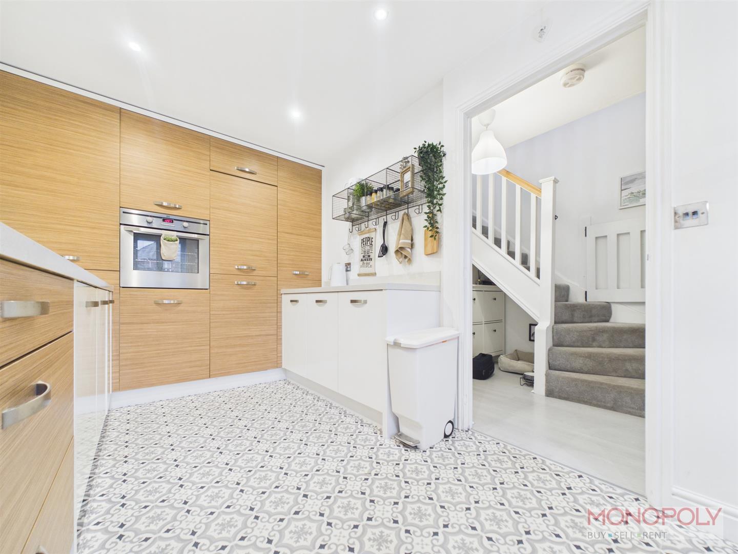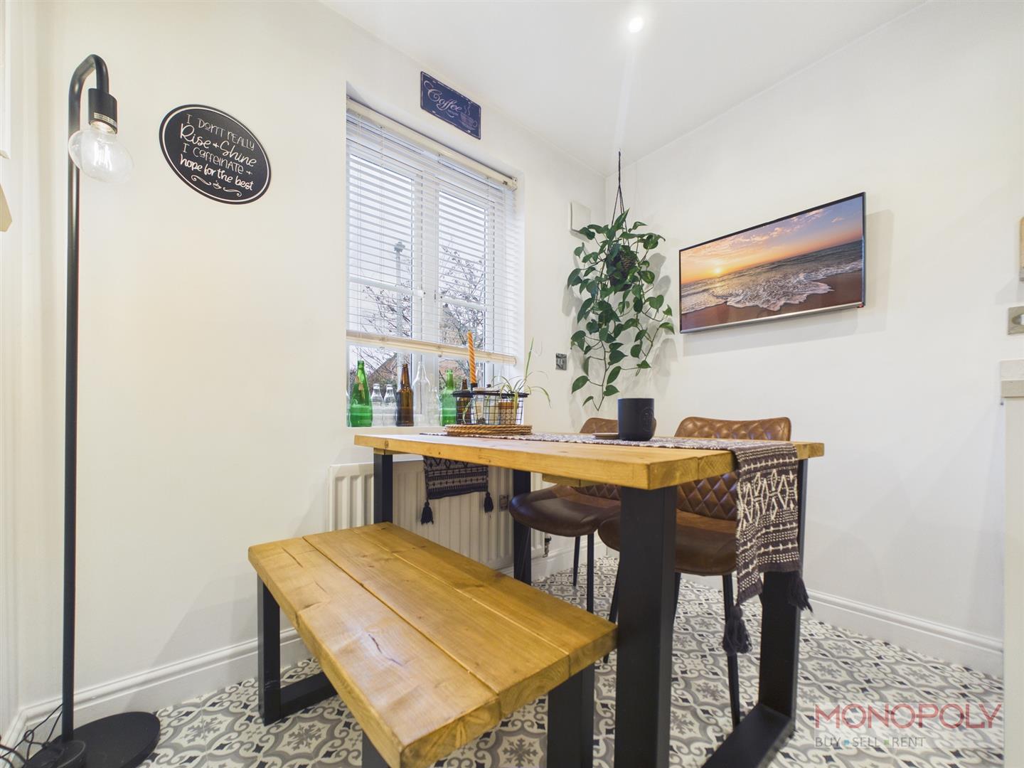 The kitchen features ample space for a dining area with a uPVC double glazed window to the front elevation, radiator and a continuation of laminate flooring.