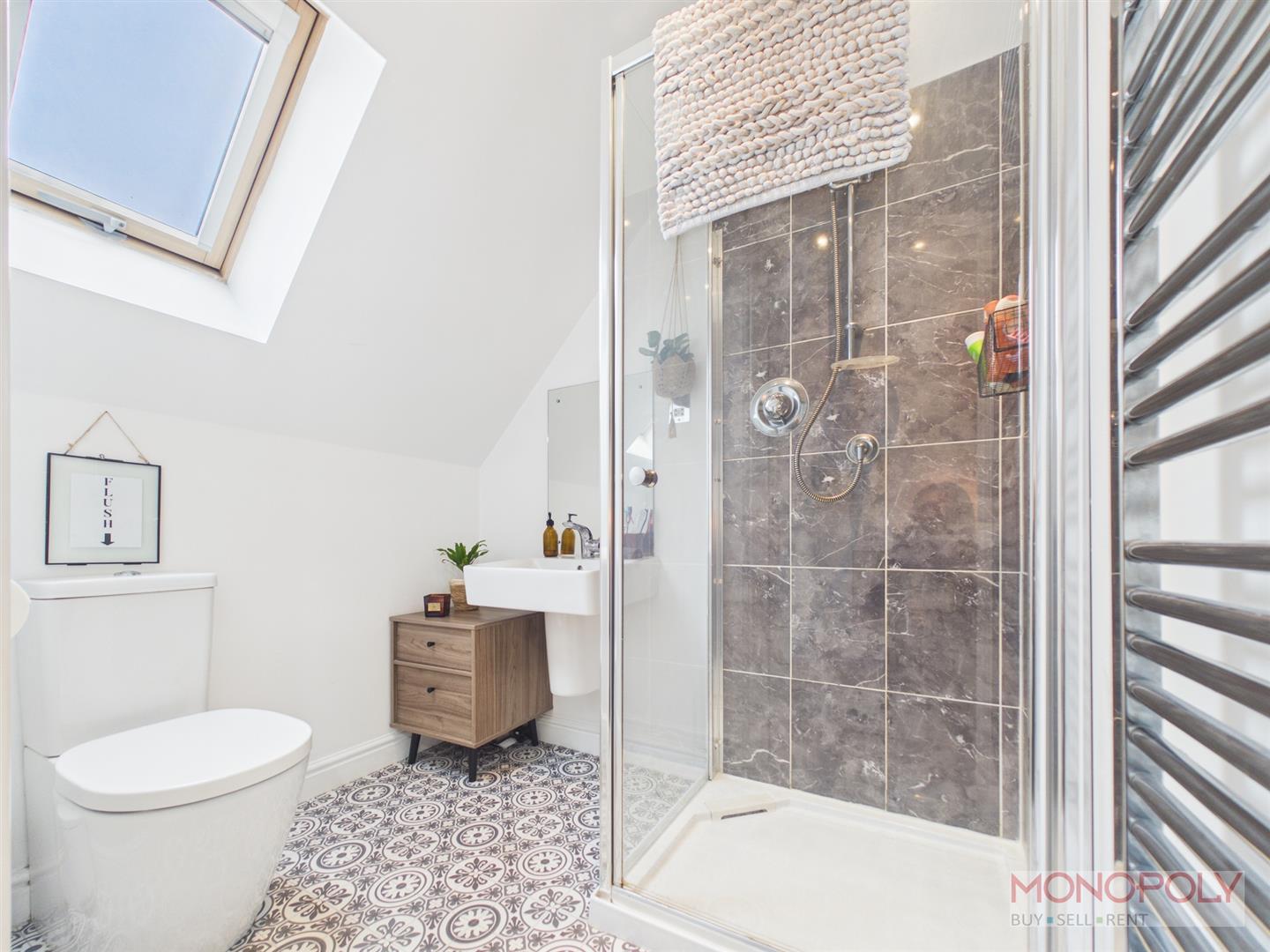 A contemporary three piece suite housing a low-level W.C., hand wash basin with mixer tap over set in a floating vanity unit and walk-in shower. Chrome heated towel rail, part tiled walls, patterned tiled floor, ceiling spotlights, extractor fan and uPVC skylight to the rear elevation.