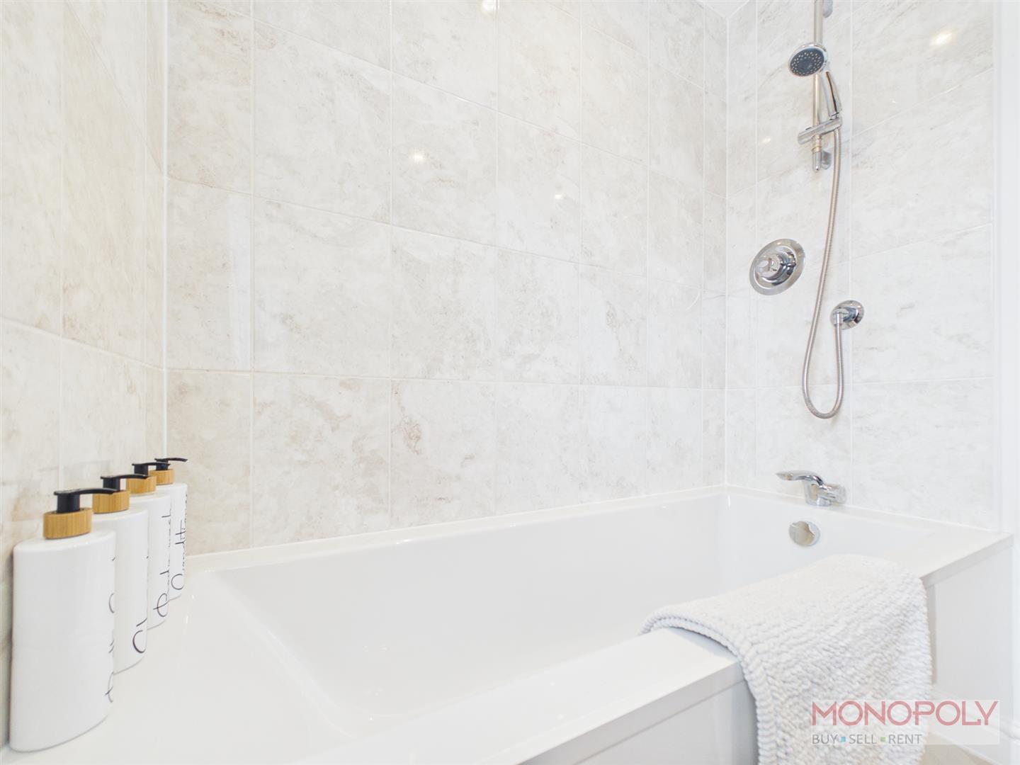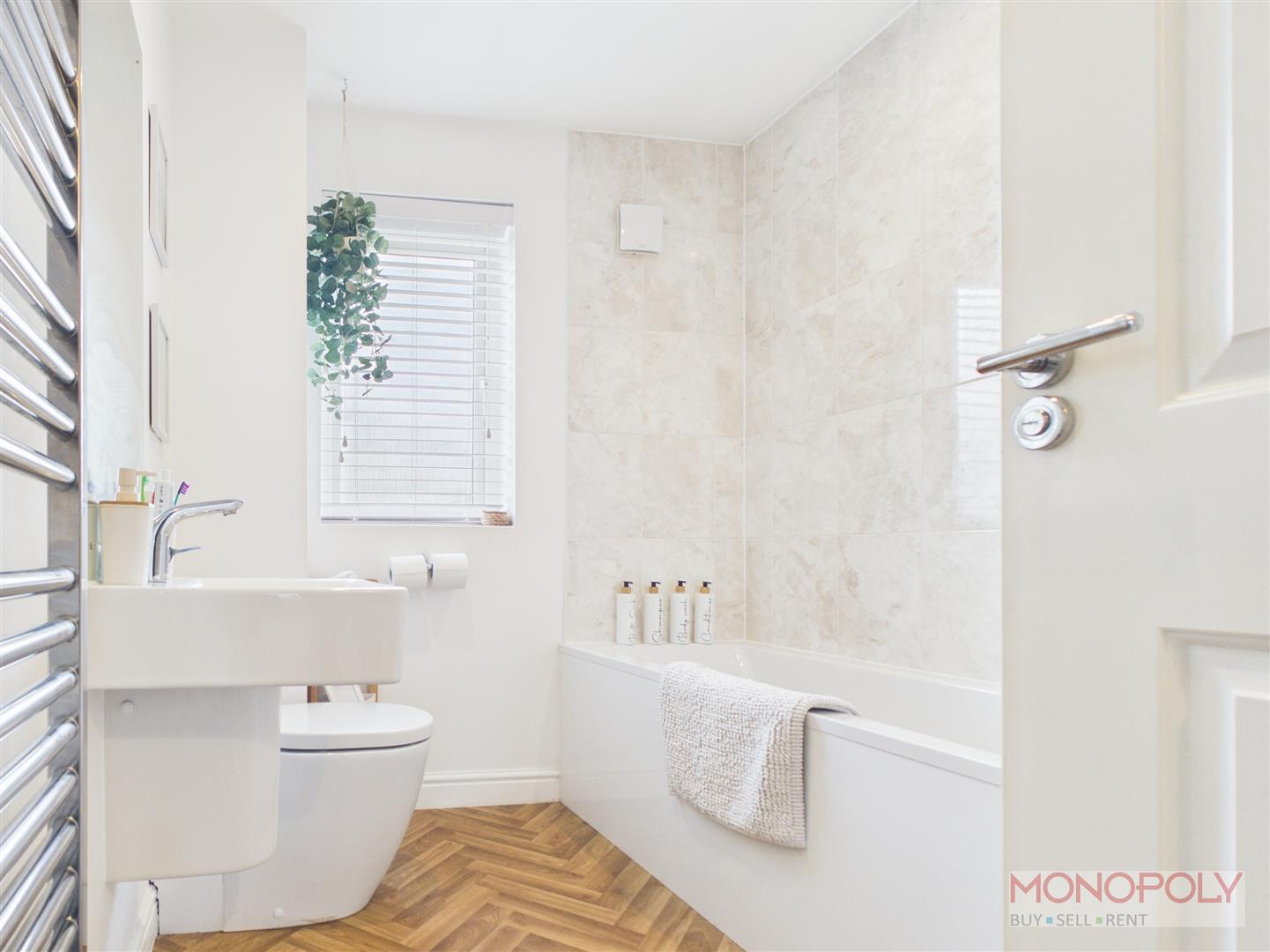 A modern three-piece suite housing a low-level W.C, hand wash basin and panelled bath with shower over. Chrome heated towel rail, shaving point, part tiled walls, parquet-effect flooring, ceiling spotlights and extractor fan. UPVC double glazed window to the rear elevation.