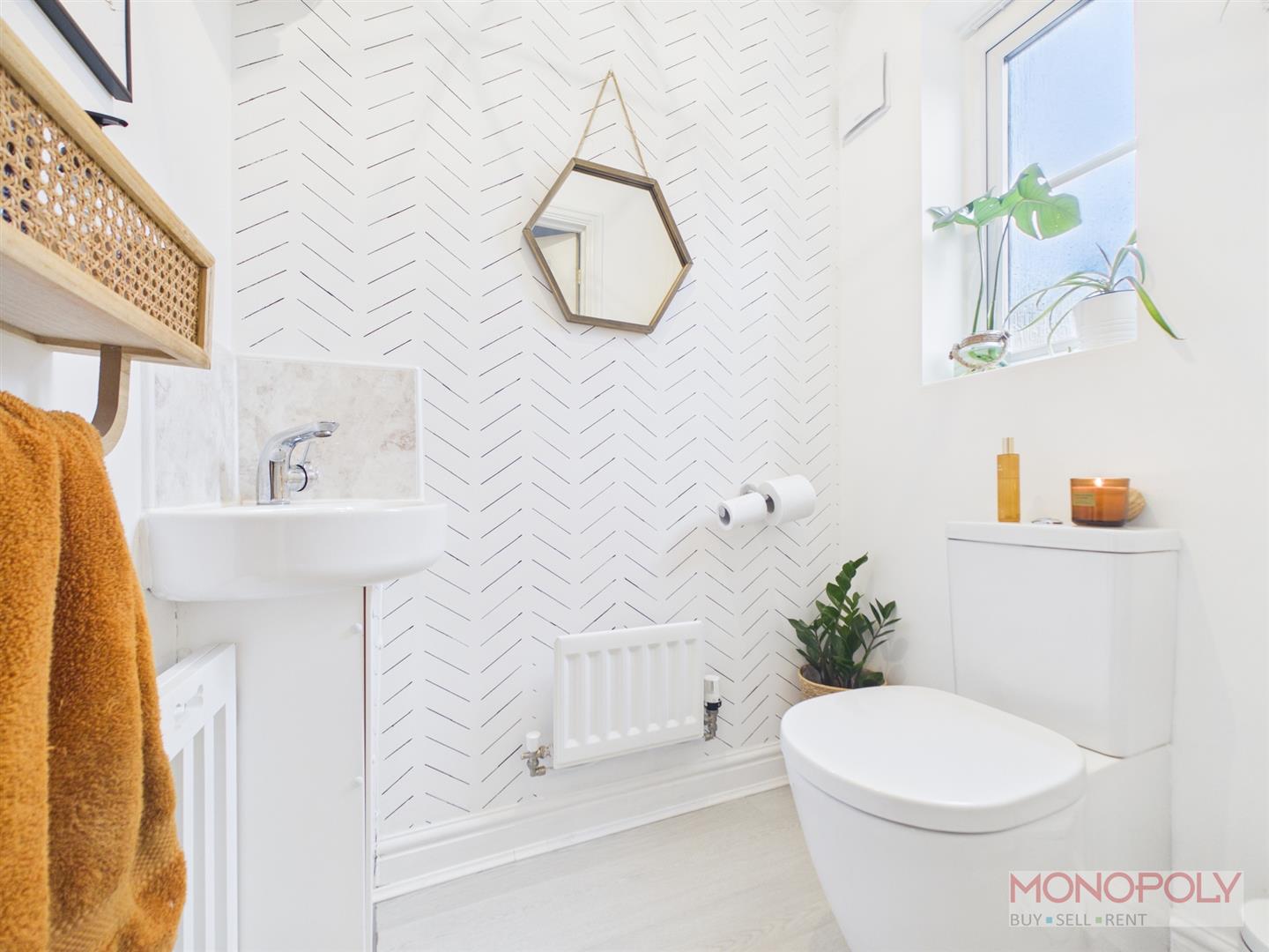 Two-piece suite housing a low-level W.C. and hand wash basin set on a floating unit. Radiator, laminate wood effect flooring and UPVC double glazed window to the front elevation.