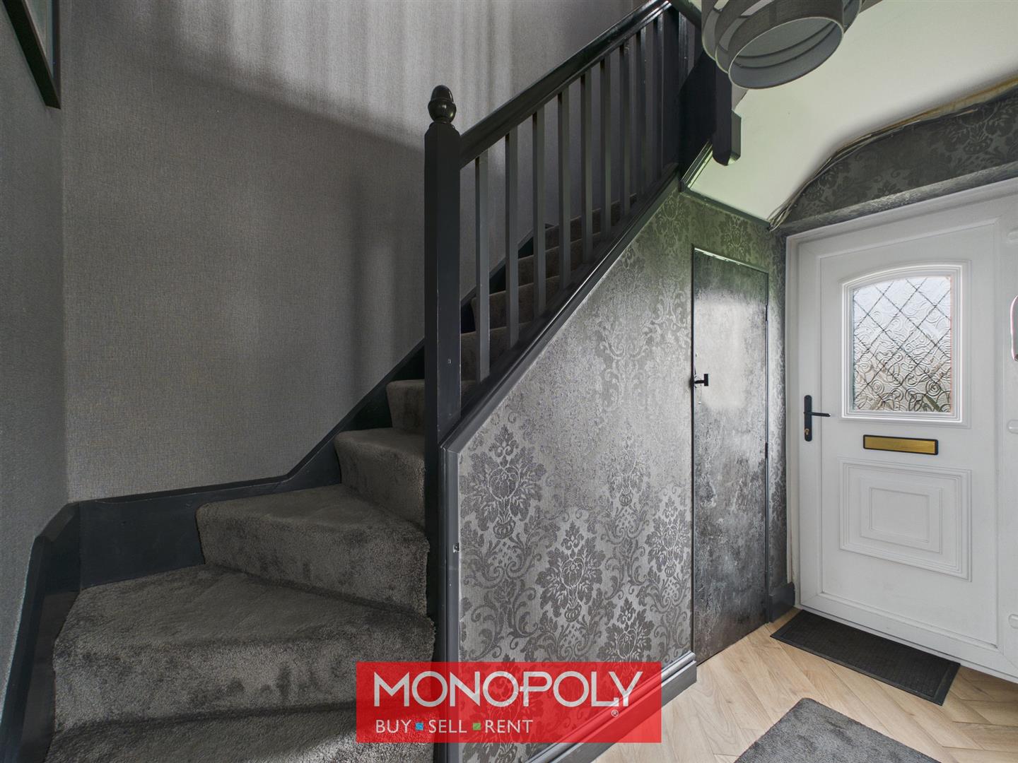A white uPVC front door opens into this welcoming entrance hall, beautifully finished with herringbone wood-effect flooring. A turned staircase rises to the first floor with a practical storage cupboard beneath, a radiator and a door leading through to the kitchen area.