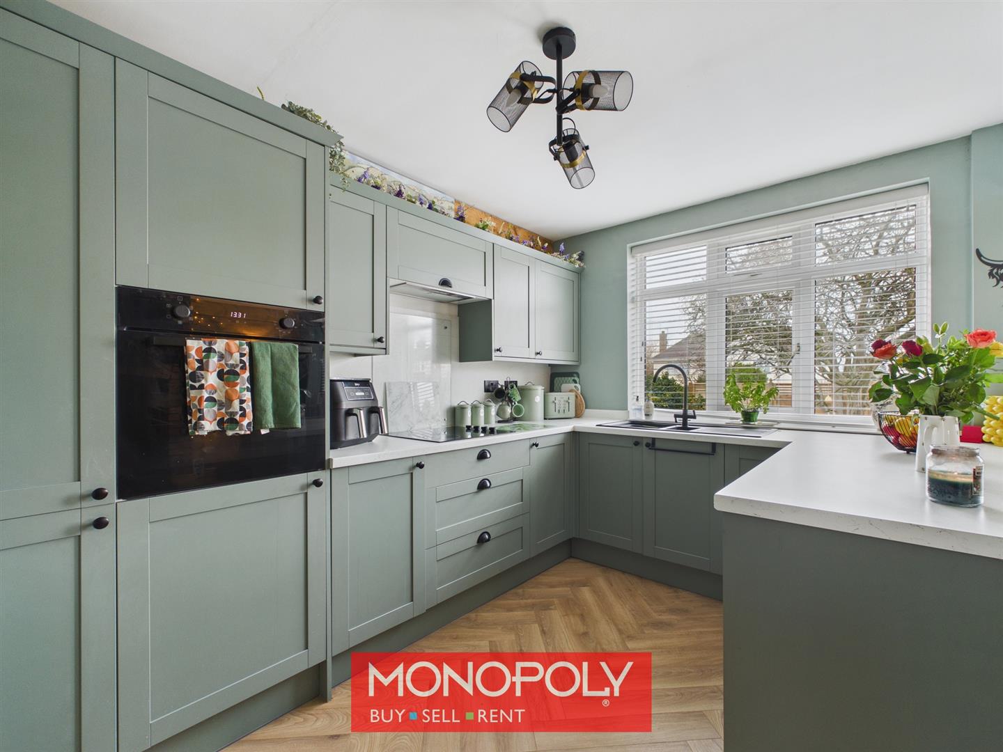 Fitted with a range of green units and marble-effect worktops, the kitchen also benefits from a breakfast bar for informal dining. Integrated appliances include an induction hob with extractor, eye-level electric oven, integrated fridge freezer, and a composite black sink. A front-facing window provides good natural light, making this a bright and practical space.