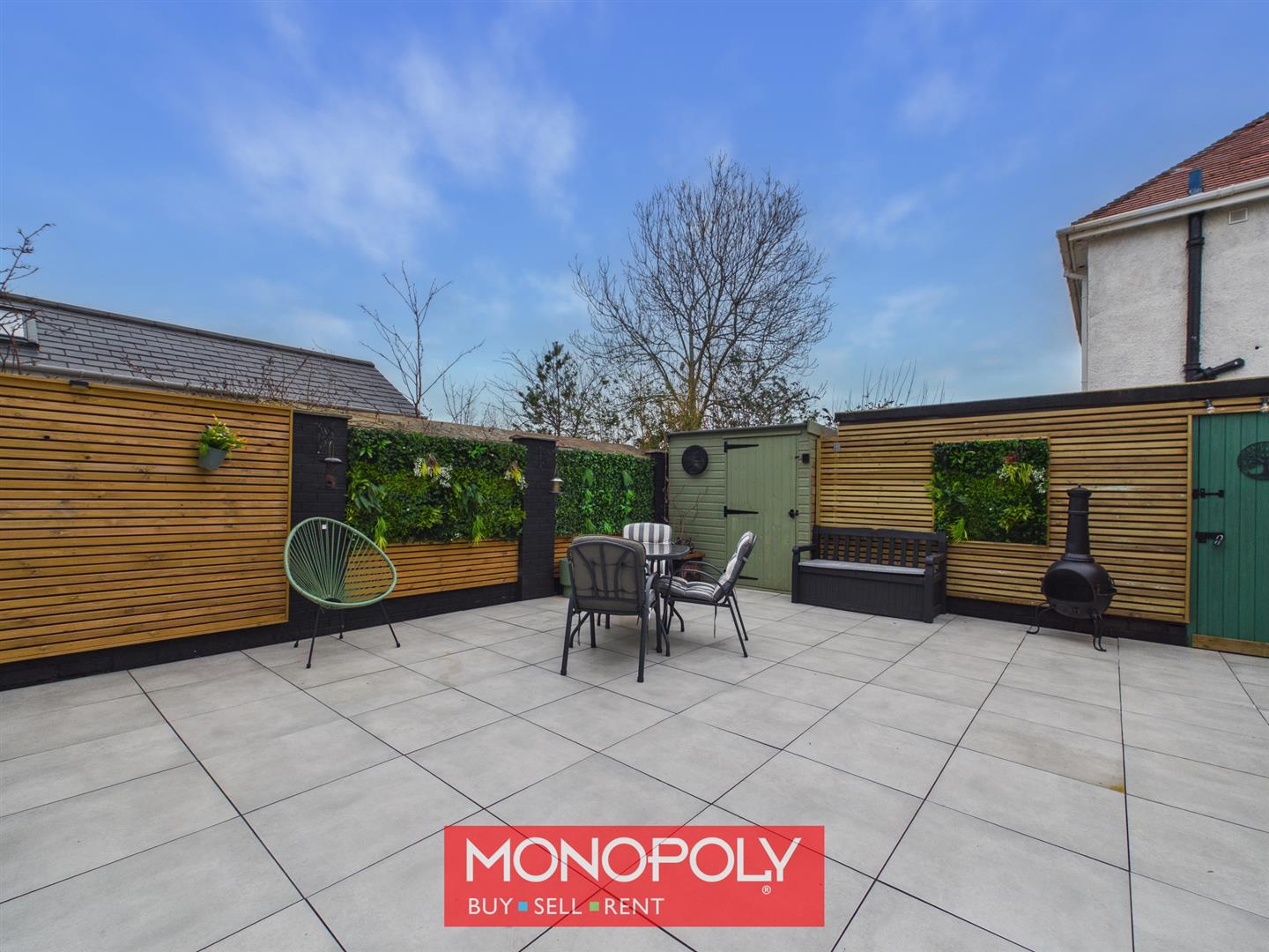 The rear garden is private and fully enclosed, offering a secure and low-maintenance outdoor space. Finished with porcelain paving, it provides an ideal setting for outdoor dining and entertaining. The garden benefits from an impressive garden playroom, two locked timber sheds, modern panelled wall borders, and a traditional coal store cupboard, combining practicality with style.