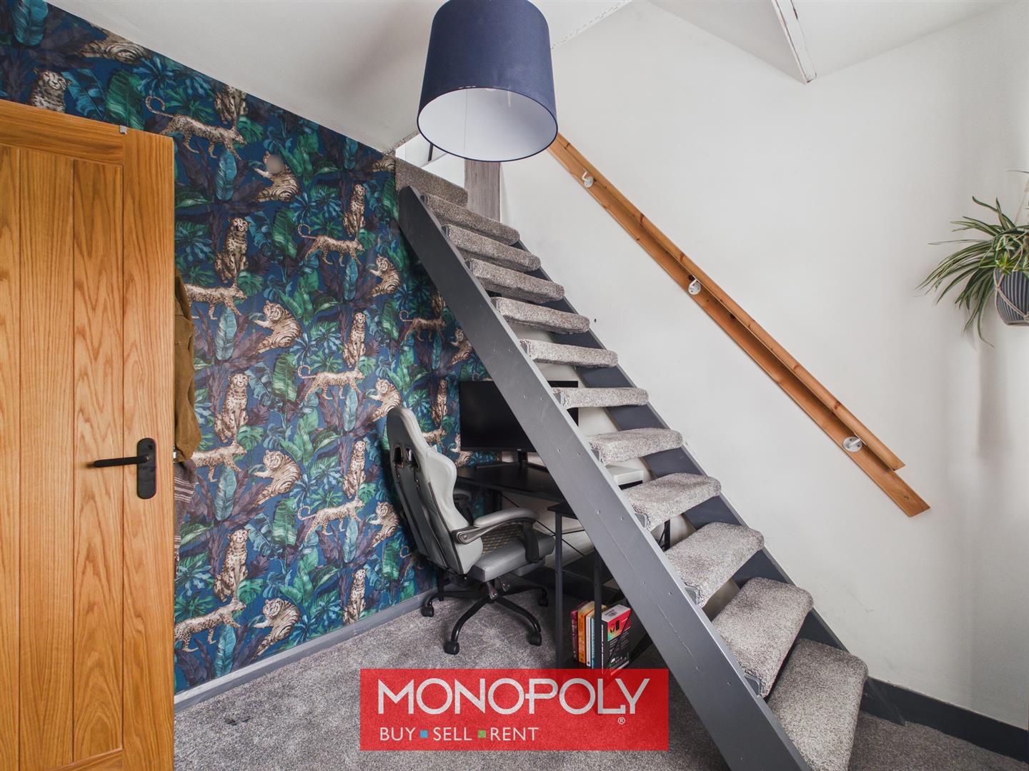 A single bedroom with rear-facing window offering pleasant views, radiator, and carpeted flooring. Stairs lead from this room to the loft space, currently used as an office.