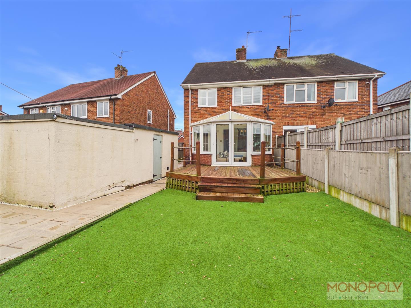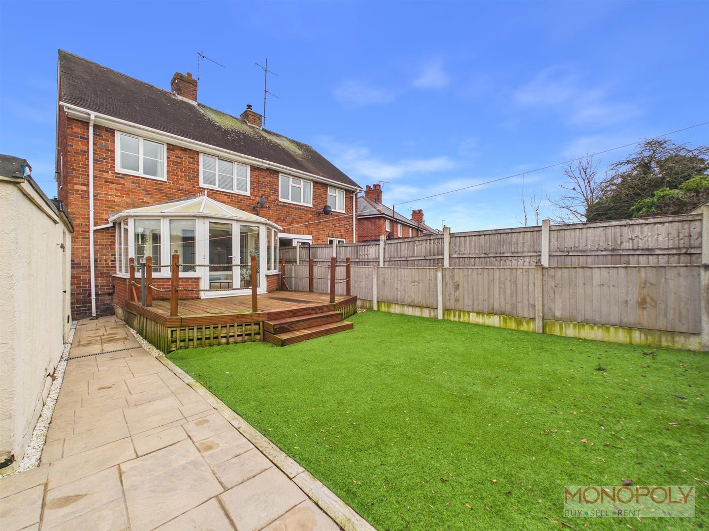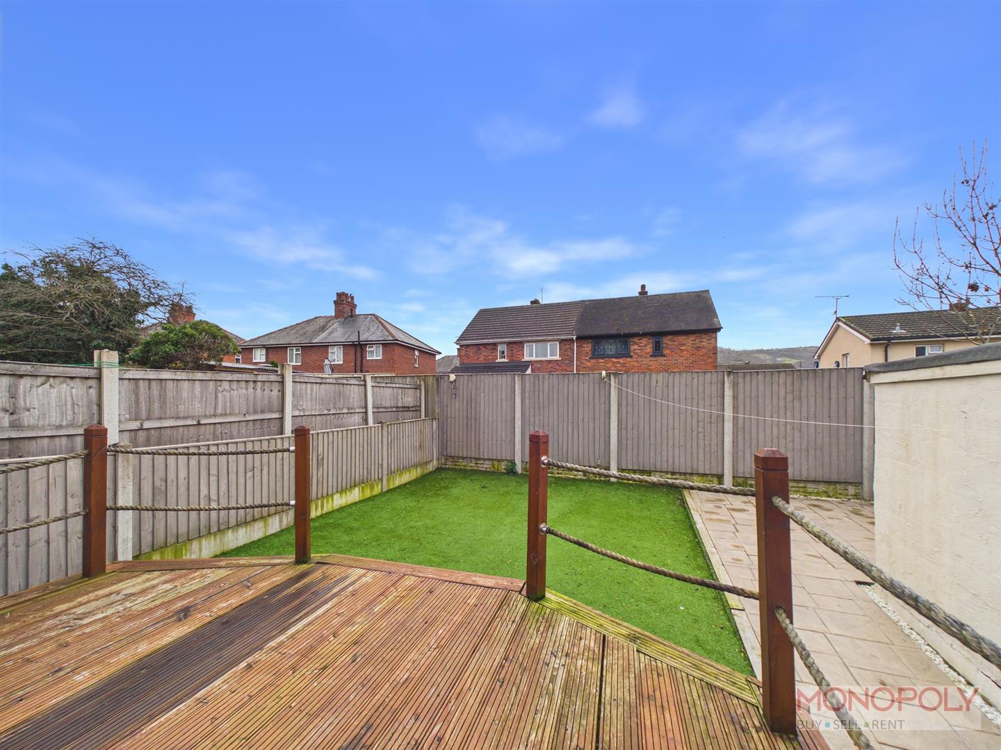 To the rear is a raised decked seating area leading on to an artificial lawned garden with a paved patio to one side. There is also access to the single garage and opening to the side of the property.