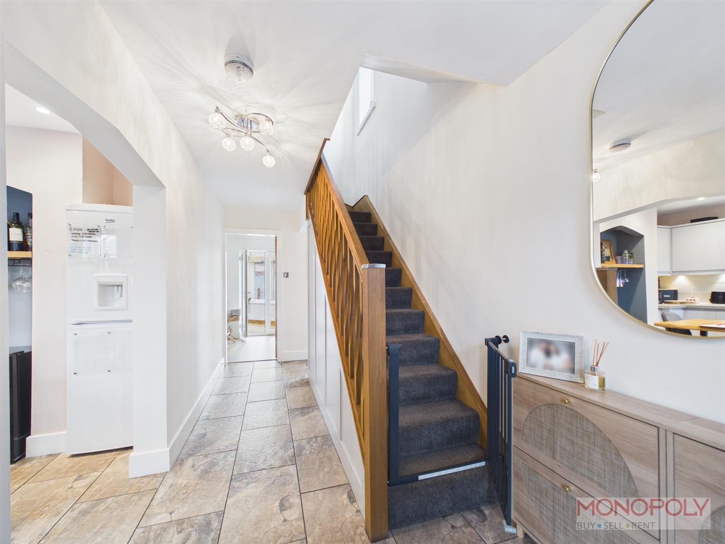 A lovely, welcoming hallway with attractive tiled flooring, stairs off to the first floor with oak balustrade and spindles, oak doors into the lounge and under stairs storage cupboard, door off to the side of the property, double glazed window, opening into the kitchen.