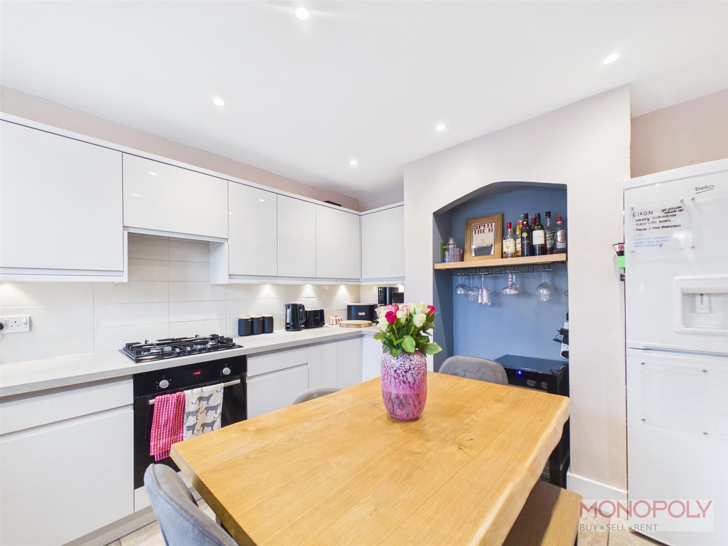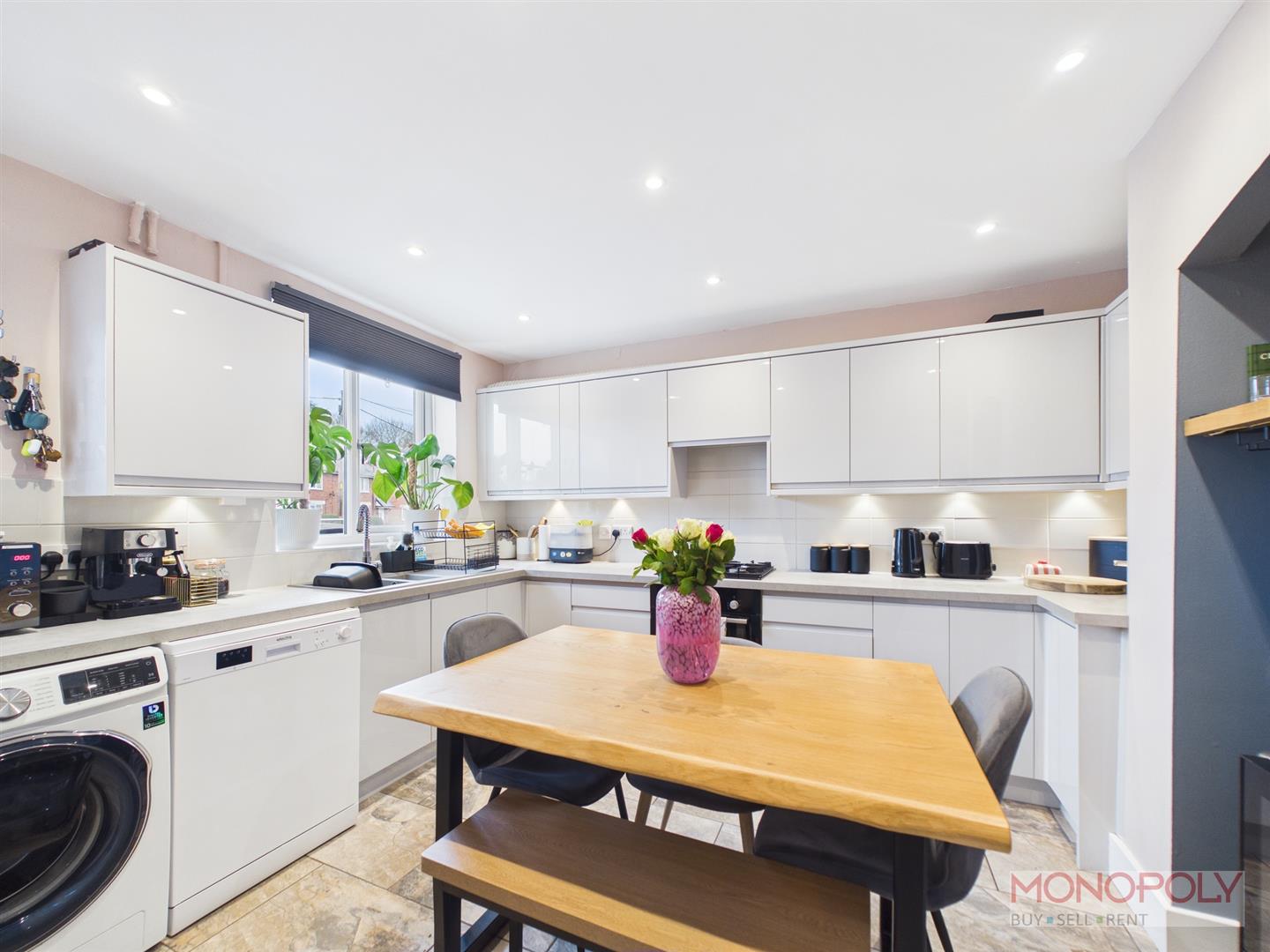 Beautifully appointed with a comprehensive range of modern wall, drawer and base units, working surface with inset 1 1/2 sink and drainer, built in electric oven, 4 ring gas hob, extractor fan, plumbing for a washing machine and dishwasher, part tiled walls, 2 double glazed windows, attractive tiled flooring.