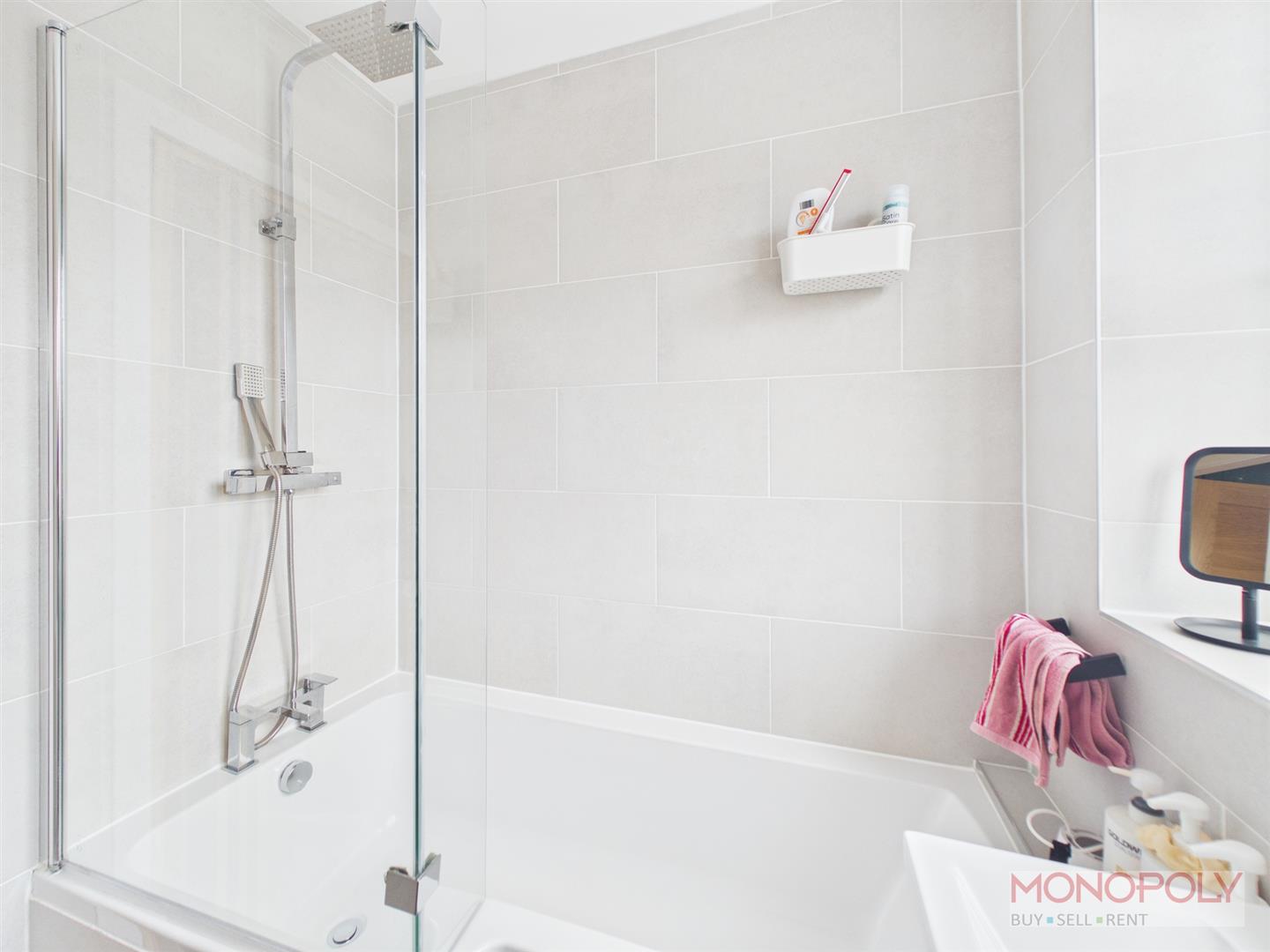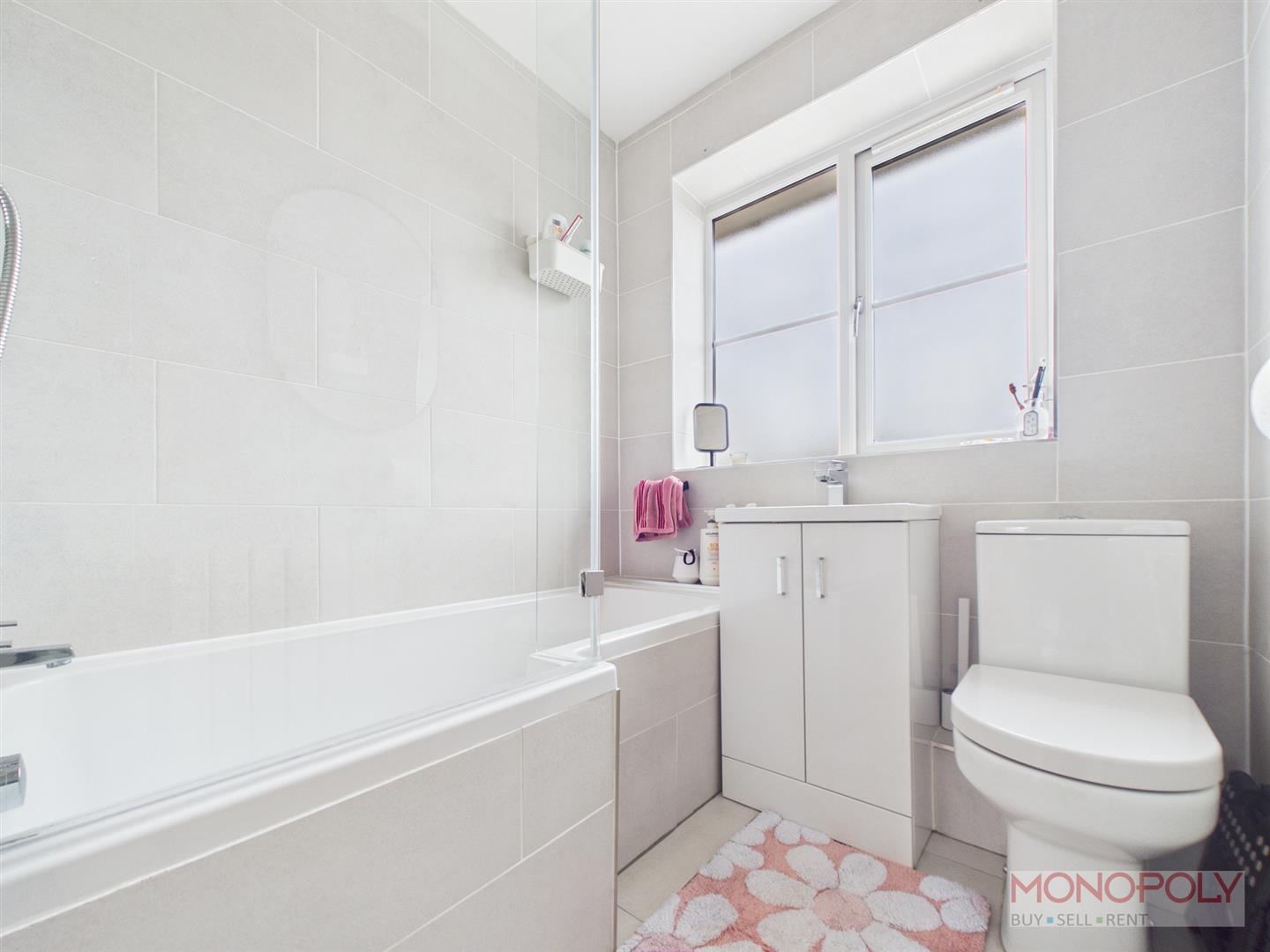 Fitted with a modern white suite comprising of a low level w.c, wash hand basin with vanity unit under, bath with dual shower head over, fully tiled walls, tiled flooring, double glazed window.