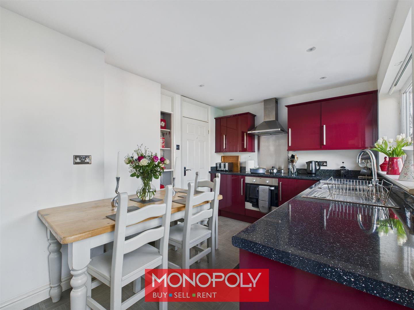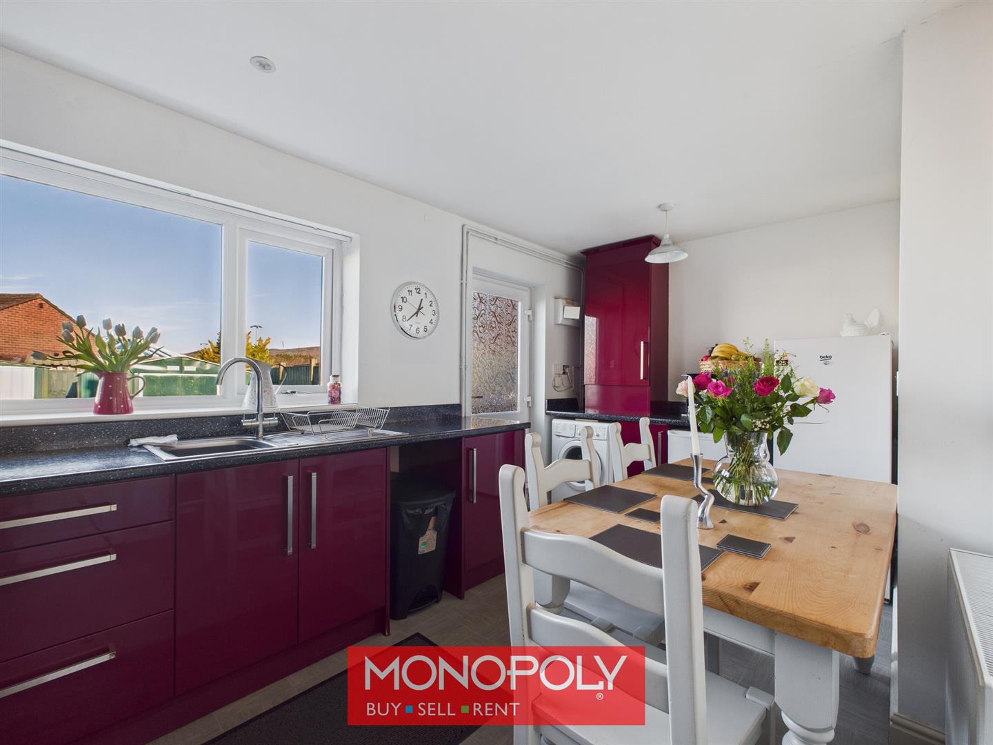 A modern kitchen diner is fitted with burgundy high-gloss units complemented by marble-effect sparkle worktops. Appliances include an electric oven and hob with a stainless steel splashback and extractor fan, with space for a dishwasher, fridge, freezer, and washing machine. A stainless steel sink with a swan-neck tap sits beneath a double-glazed rear window, while recessed shelving, downlights, a radiator, and vinyl tiled flooring complete the space. A cupboard houses the Worcestershire combi boiler, and a double-glazed rear door with privacy glazing provides direct access to the rear garden.