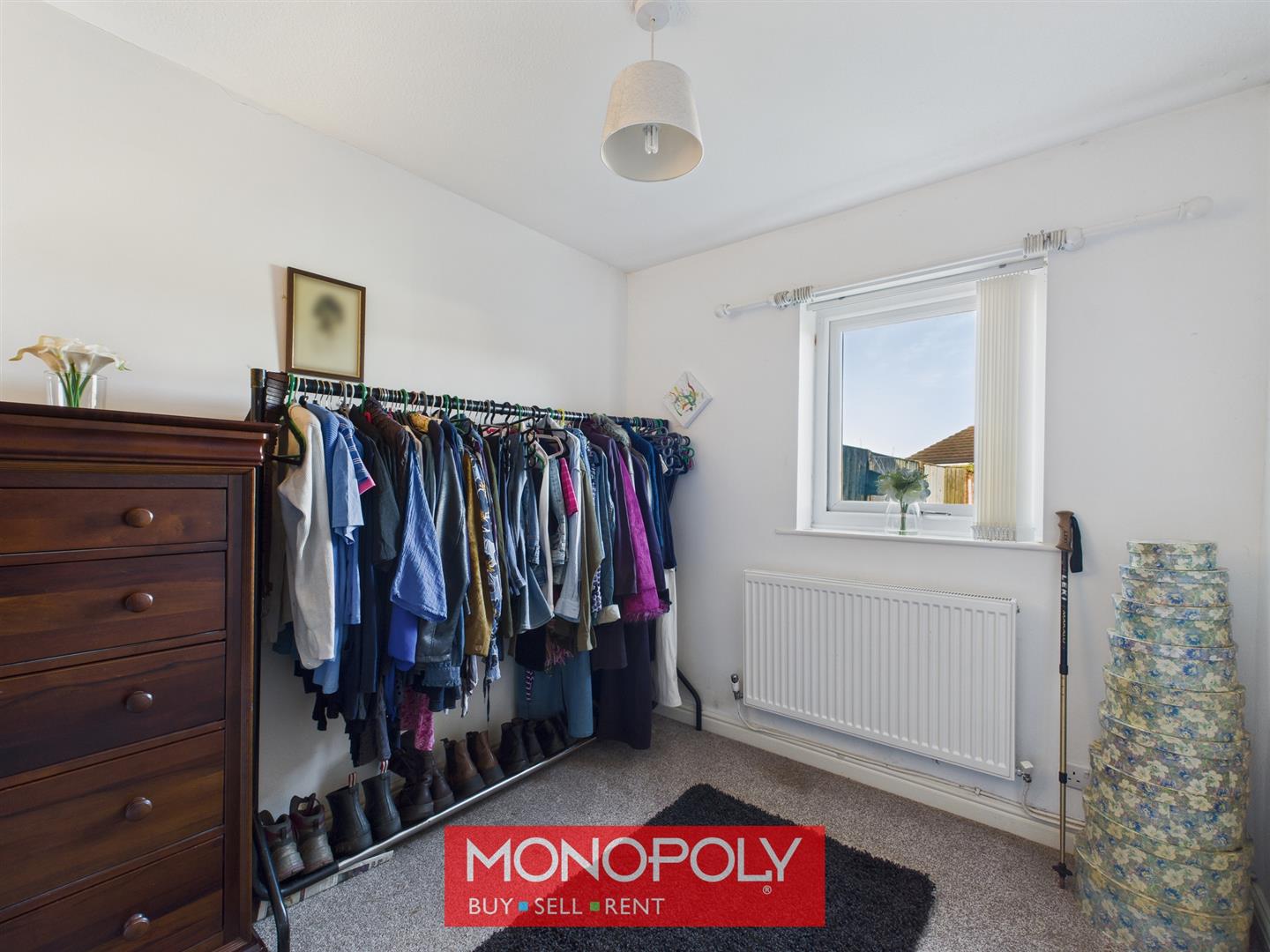 Carpeted bedroom with a radiator and a uPVC double-glazed window overlooking the rear of the property. Currently used as a dressing room, this versatile space would equally suit use as a home office or nursery.