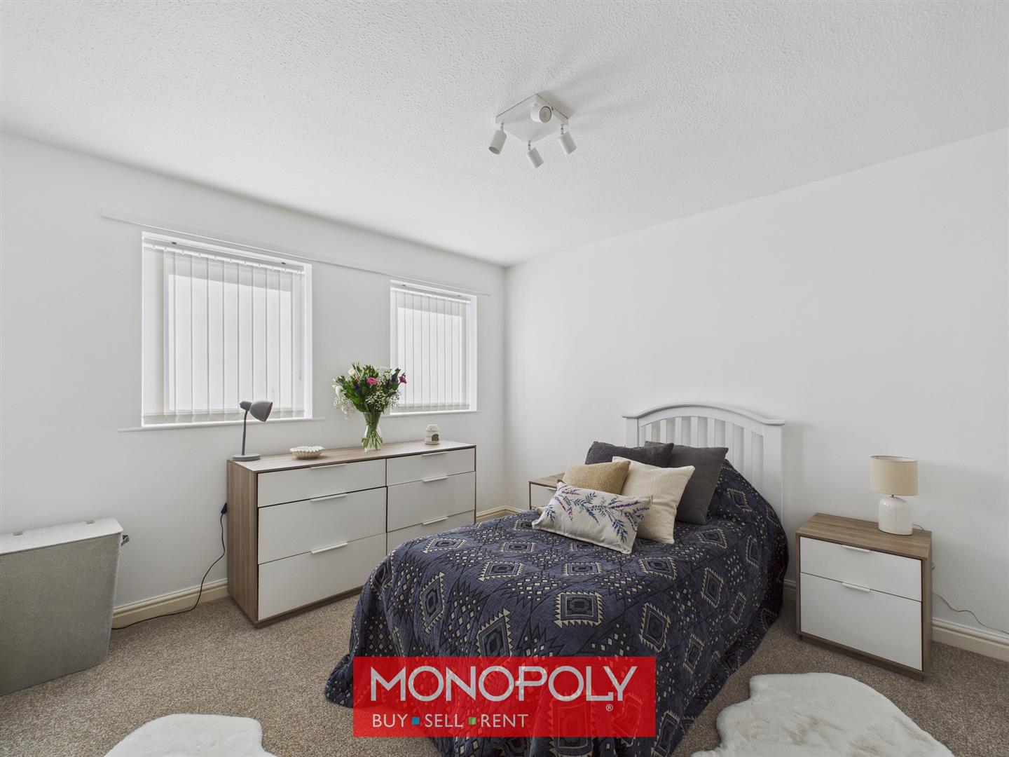 A generous master bedroom with carpeted flooring, benefiting from two double-glazed windows overlooking the front and allowing plenty of natural light. There is ample space for storage cupboards, and the room is completed by a radiator.