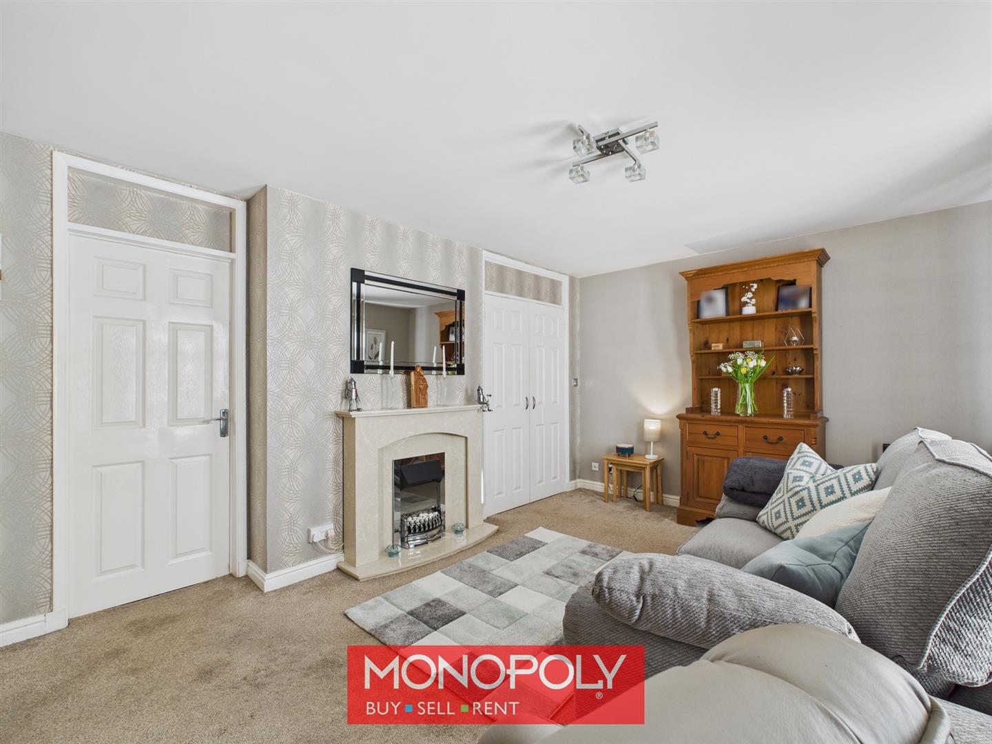 A comfortable, carpeted lounge featuring an attractive central fireplace with a marble surround housing an electric fire. A large double-glazed window overlooks the front of the property, a radiator and a door leads through to the kitchen diner.