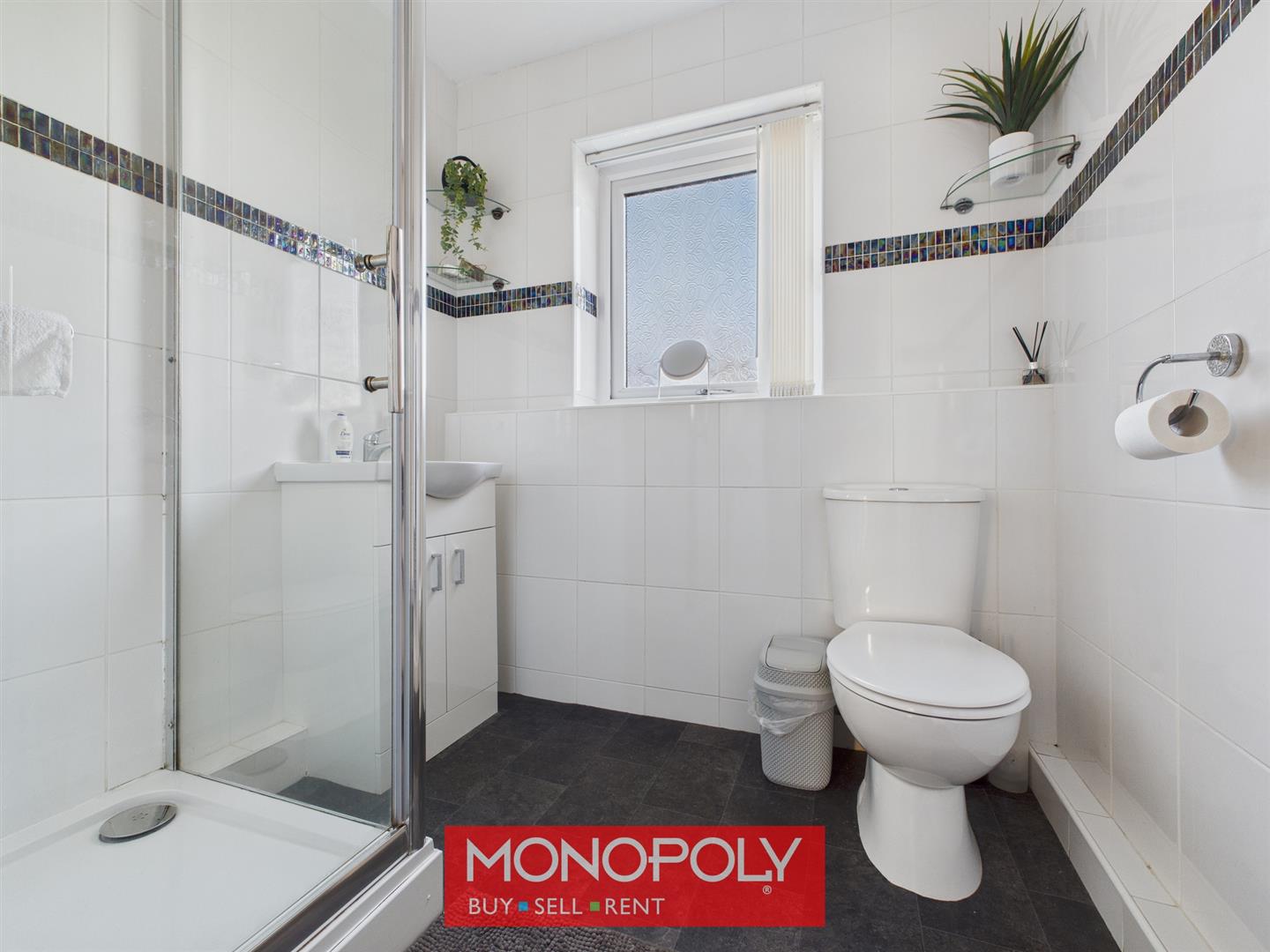 A modern white three-piece suite comprising a low-flush WC, vanity unit, and a corner shower with an electric shower. The room is finished with tiled-effect vinyl flooring, tiled walls with a decorative mosaic border, a chrome towel rail, extractor fan, and a privacy-glazed window.