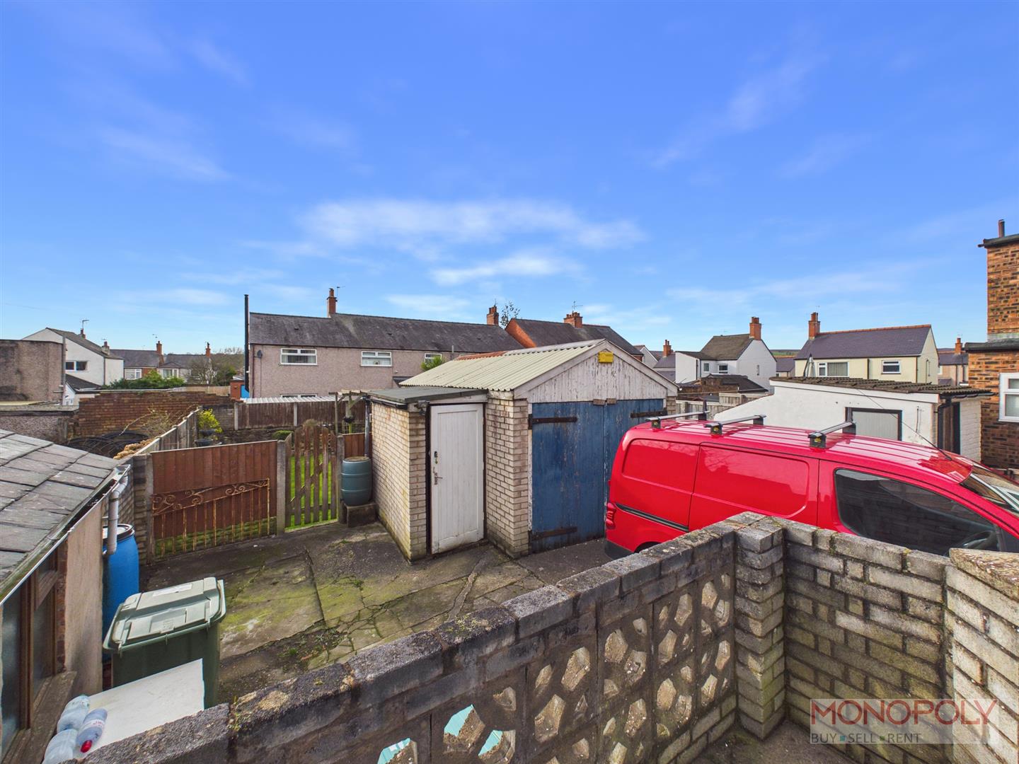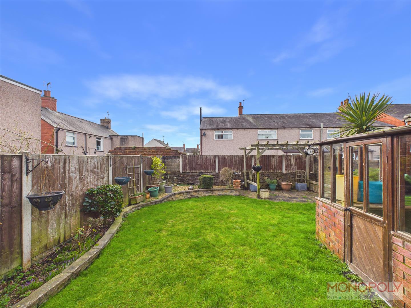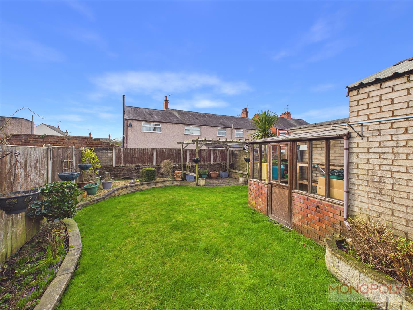 A good size rear garden with a raised concrete patio off the back door and steps down to a lower level where there is access to a single garage and brick built storage shed. There is gated access to and attractive, well maintained garden, predominantly lawned with raised flower beds and a paved patio. There is access to a greenhouse and another shed.