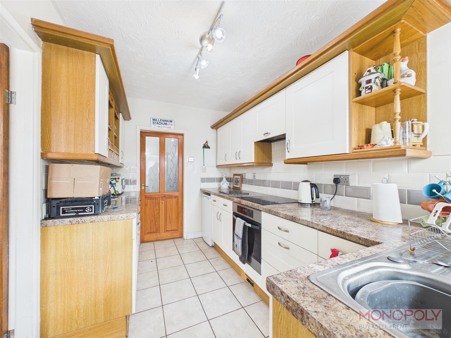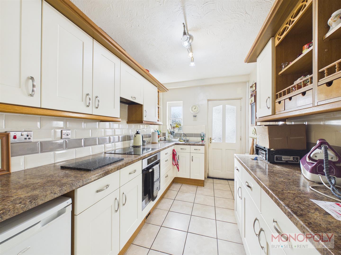 Fitted with matching wall, drawer and base units, working surface with inset stainless steel sink and drainer, built in electric oven, 4 ring electric hob, part tiled walls, space for a refrigerator, tiled flooring, double glazed window, door off to the dining room and utility room.