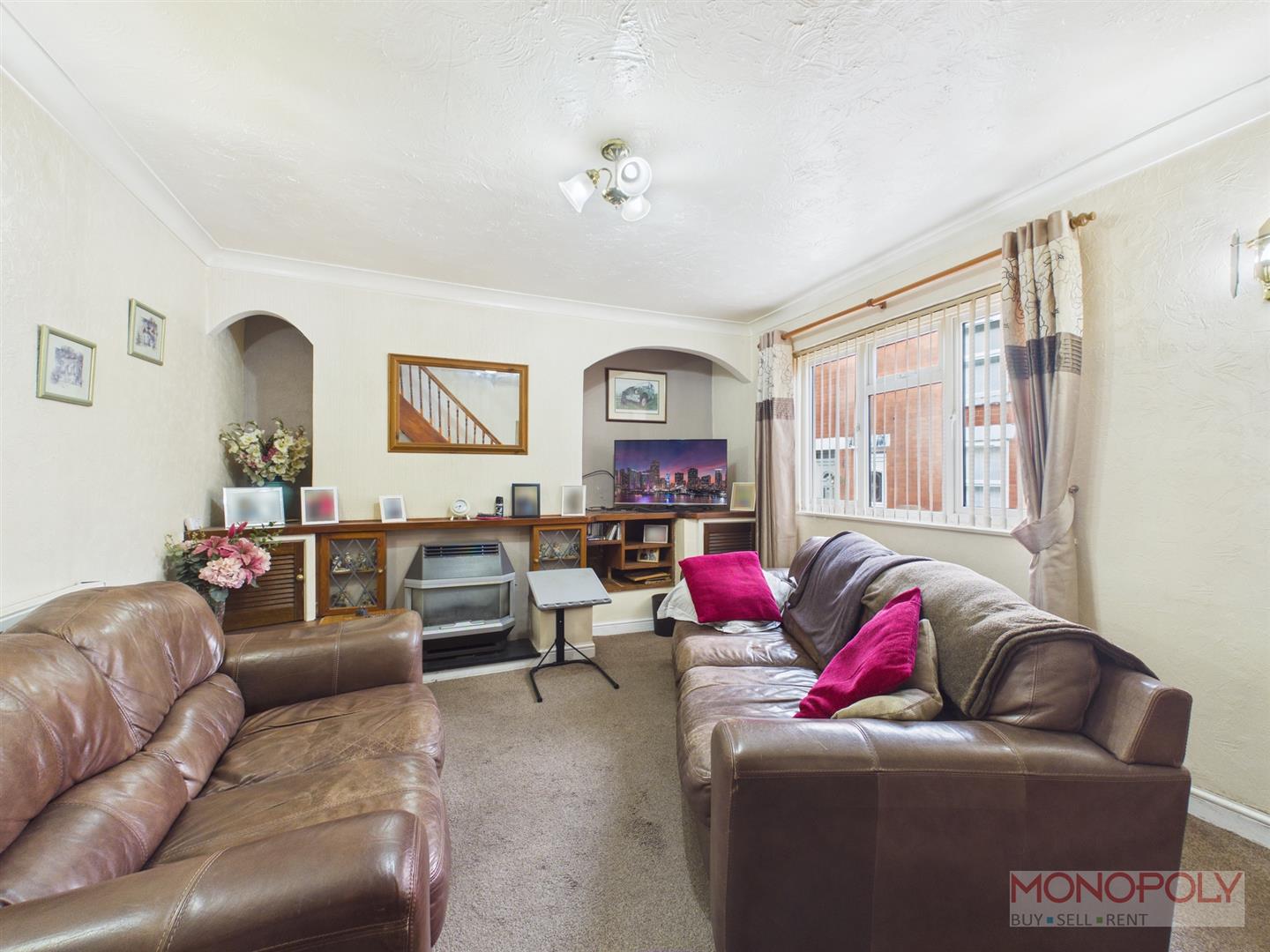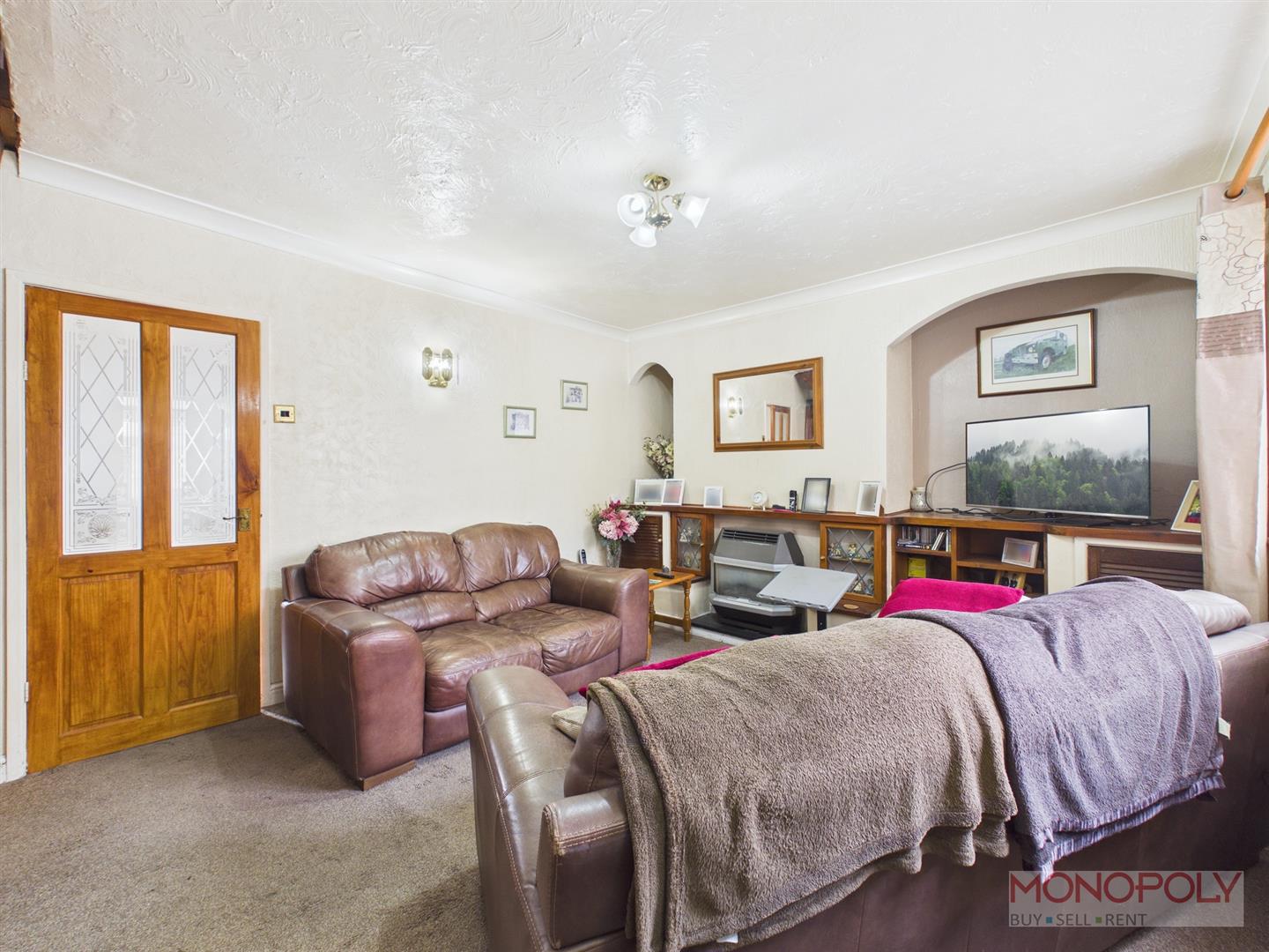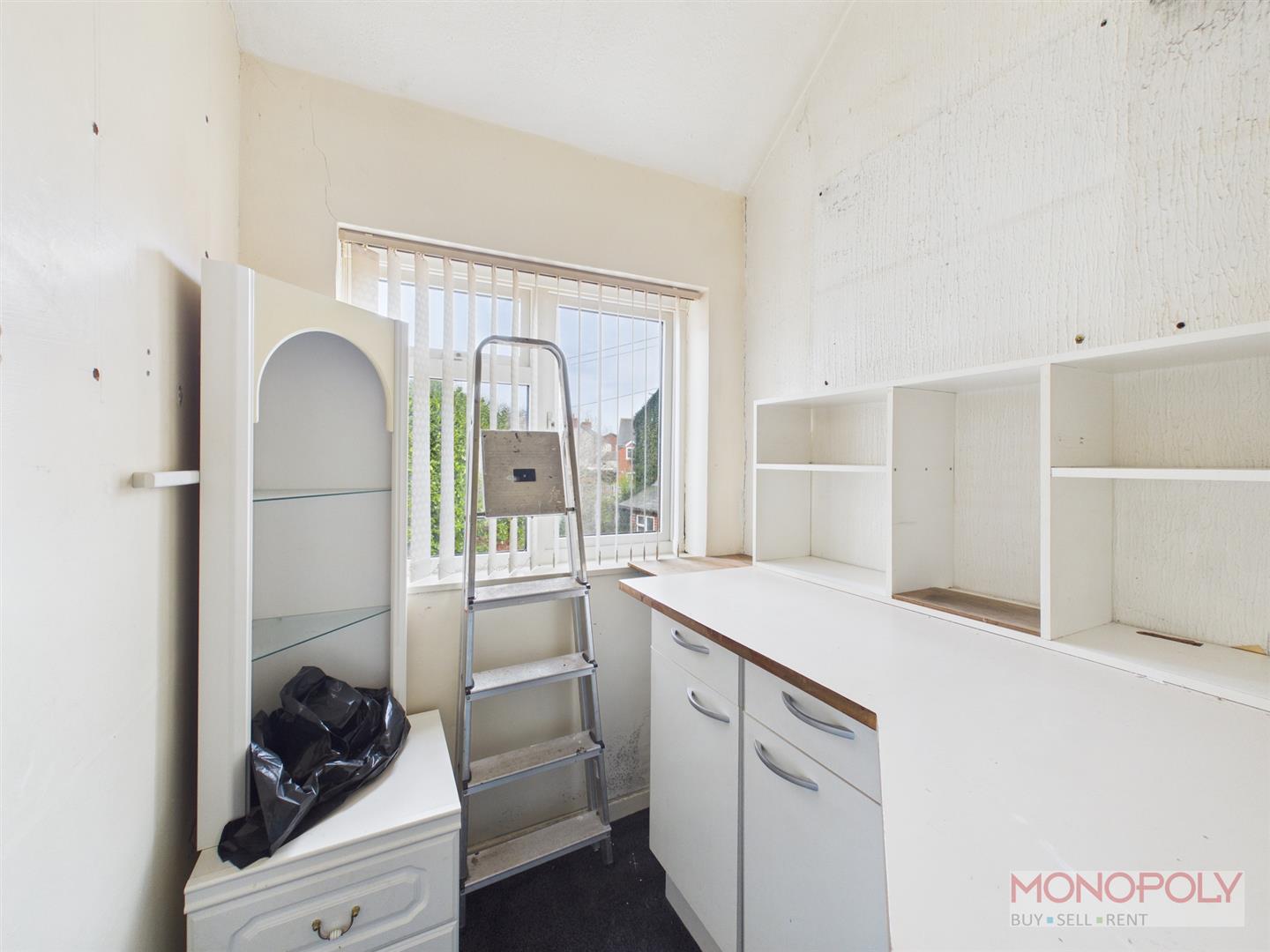 With a double glazed window to the front, Gas fire with back boiler (fire is currently un-serviceable), wooden plinths and display shelves, carpeted flooring.