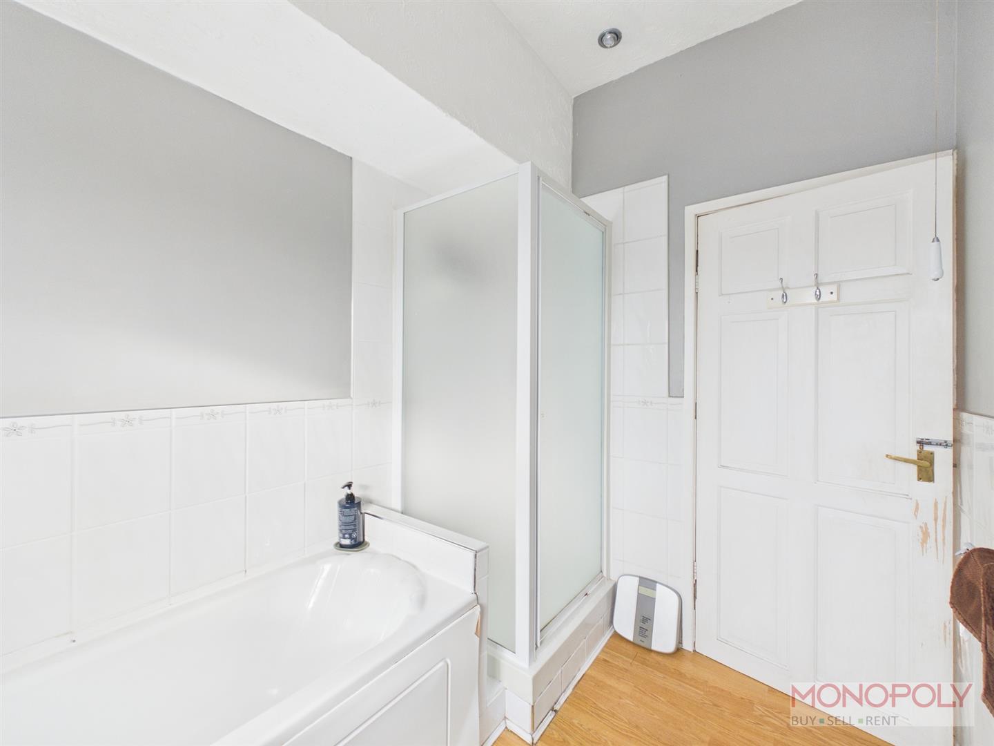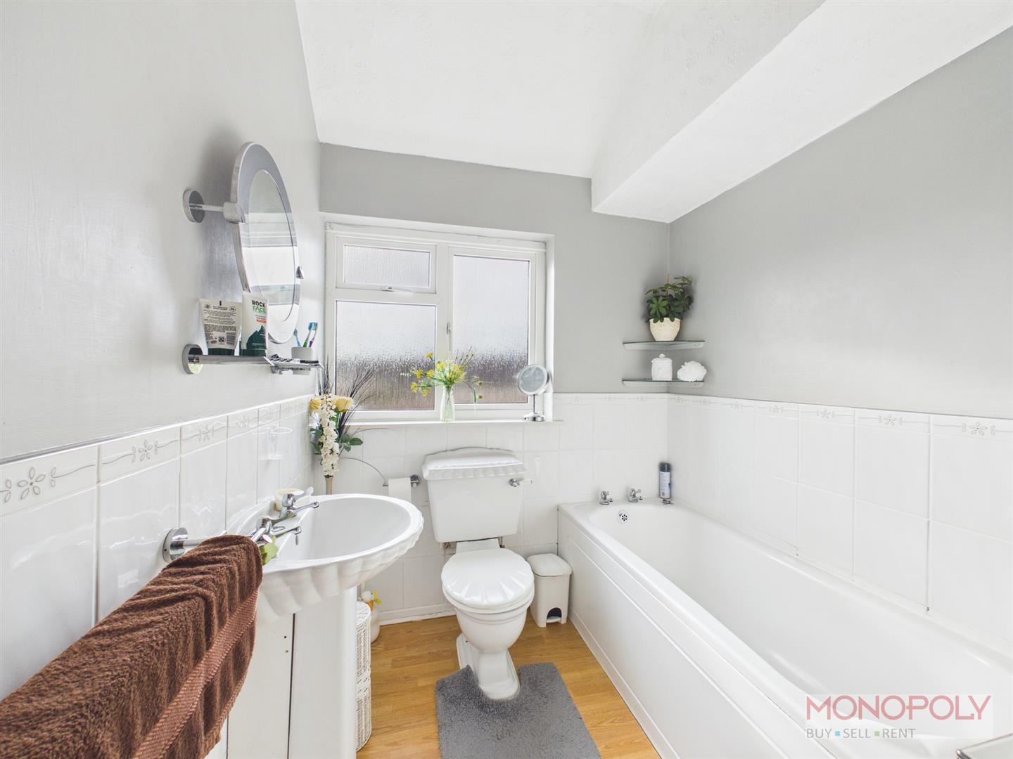 Fitted with a low level w.c, pedestal wash hand basin, bath, separate shower cubicle, wood effect flooring, double glazed window, part tiled walls.