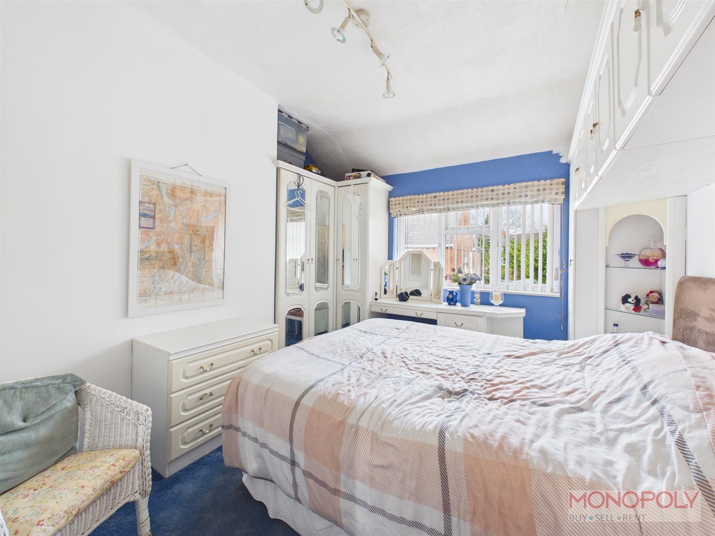 A double bedroom with fitted wardrobes and high level units, carpeted flooring, double glazed window to the front.