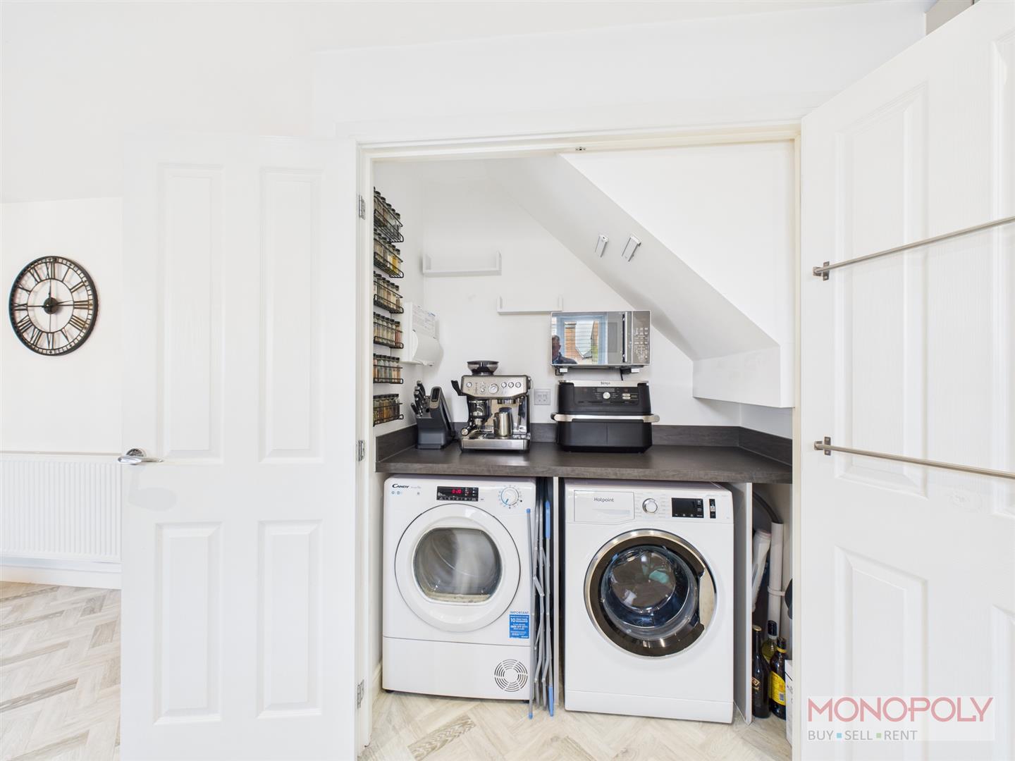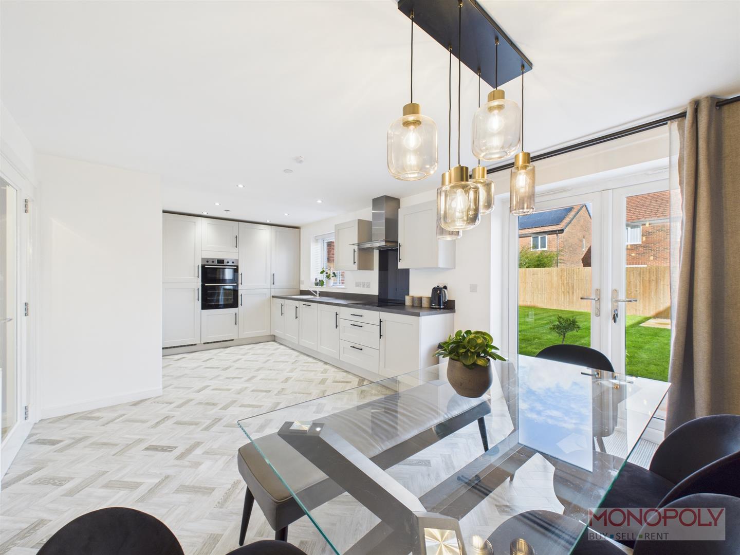 A stunning, superbly appointed kitchen/dining room fitted with a comprehensive range of wall, drawer and base units, working surface with inset 1 1/4 stainless steel sink and drainer, built in electric oven and grill, 4 ring electric hob, glass splash back, extractor fan, attractive Amtico signature collection flooring, double glazed window, double glazed french doors off to the rear garden, double doors to a utility area which has plumbing for a washing machine, space for a dryer, work top.
