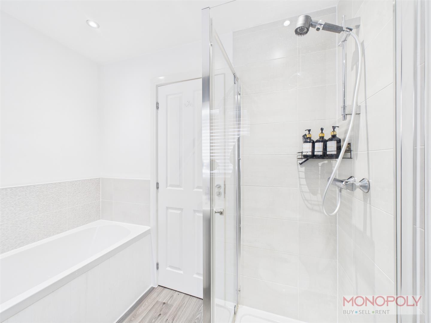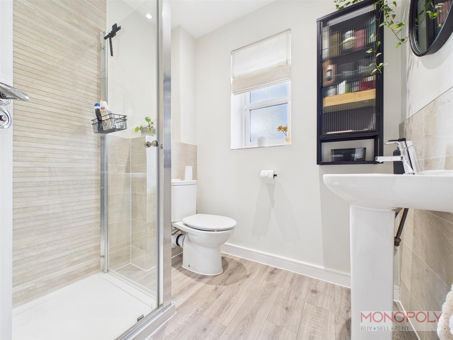 Fitted with a 4 piece suite comprising of a low level w.c, pedestal wash hand basin, bath, fully tiled shower cubicle, wood effect cushioned flooring, part tiled walls, double glazed window.