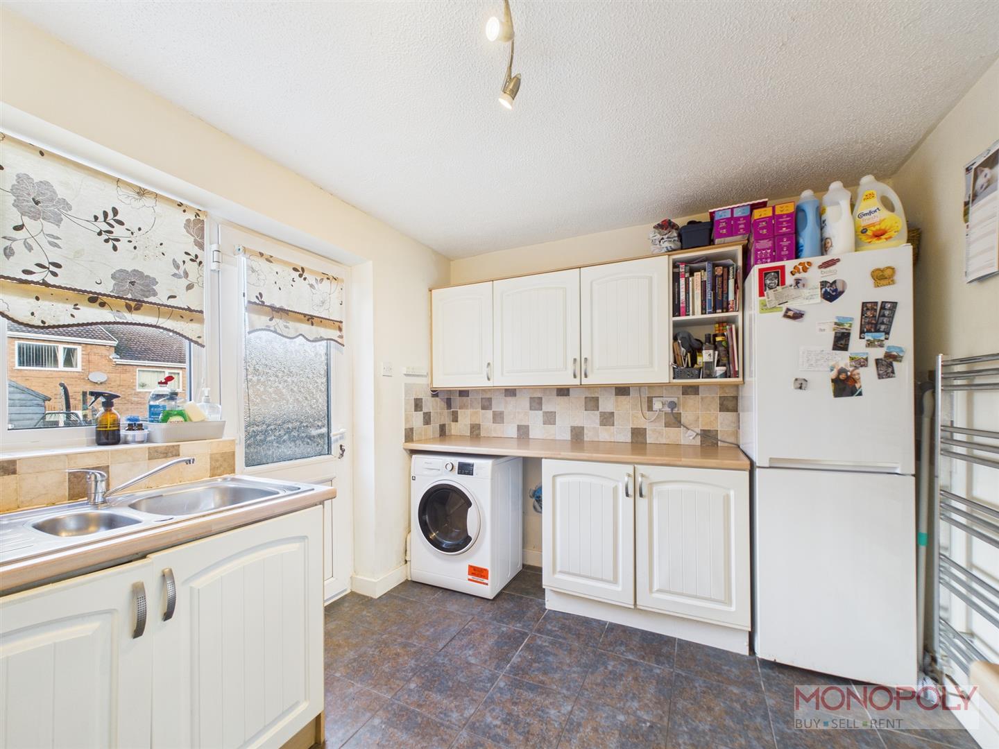 Fitted range of wall and base units, complementary worktops, four ring gas hob, extractor, single oven, stainless sink/drainer, mixer tap, spaces for washing machine and fridge/freezer, tiled splashback, chrome towel rail, external door to rear.