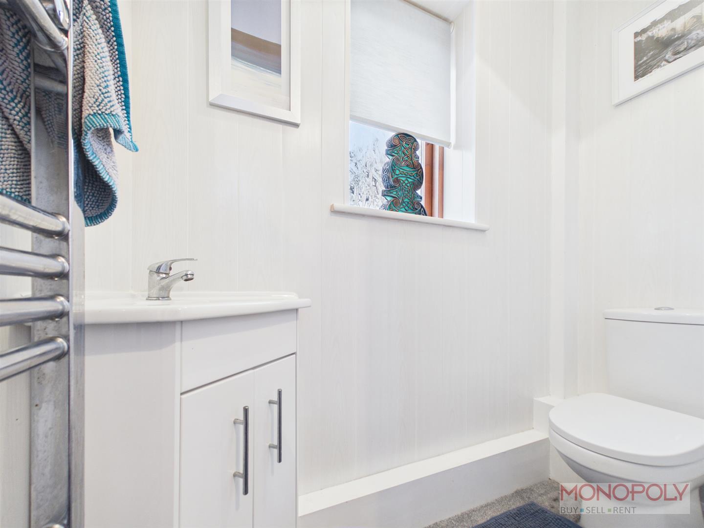 Two piece suite comprising low-level WC and wash hand basin with vanity storage under. Wooden double glazed frosted window to the front elevation, ceiling light point and chrome heated towel rail.