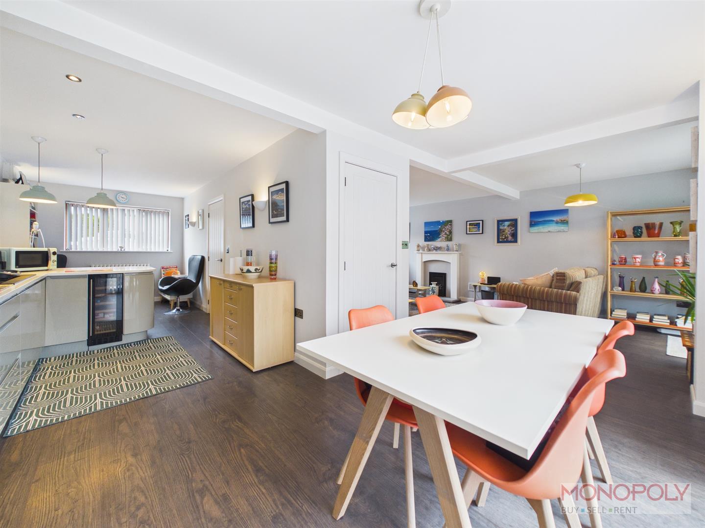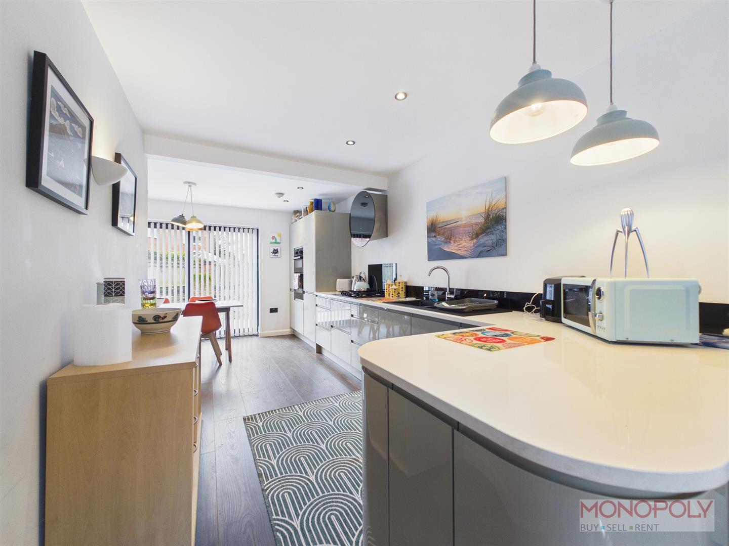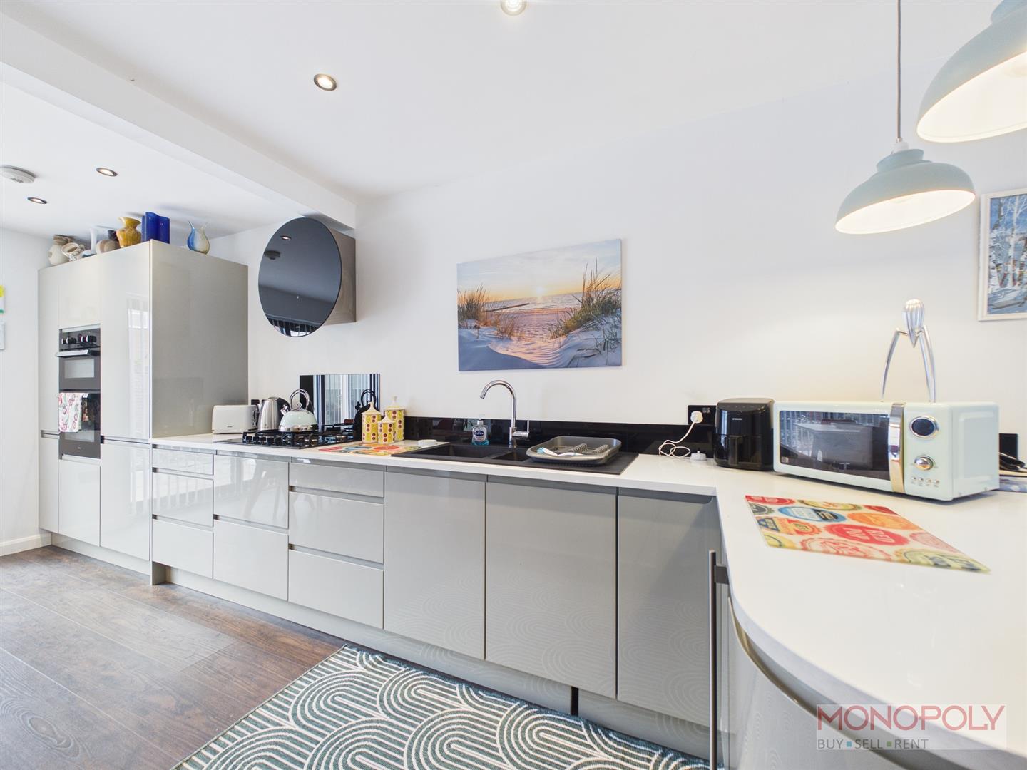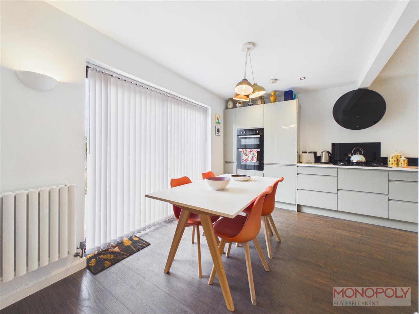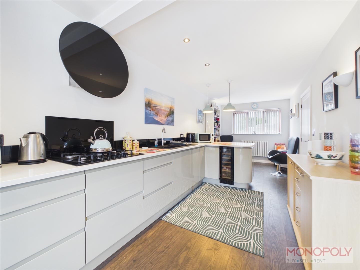 Modern kitchen housing a range of wall, drawer and base units with Quartz work surface over. Integrated appliances to include fridge-freezer, washing machine, wine fridge, eye-level double oven and grill, five ring gas hob and stylish circular wall-mounted extractor above. Space for further appliances including slimline dishwasher. 1.5 composite dink unit with mixer tap over. Integrated breakfast bar with storage and seating area. Office/study area to the front elevation. Space for dining table. Under-stairs storage cupboard with plumbing for washing machine. Wooden laminate flooring, two radiators, recessed LED lighting, two pendant lights over breakfast bar and additional pendant light over dining area. Wooden double glazed window to the front elevation and sliding doors to rear garden area.