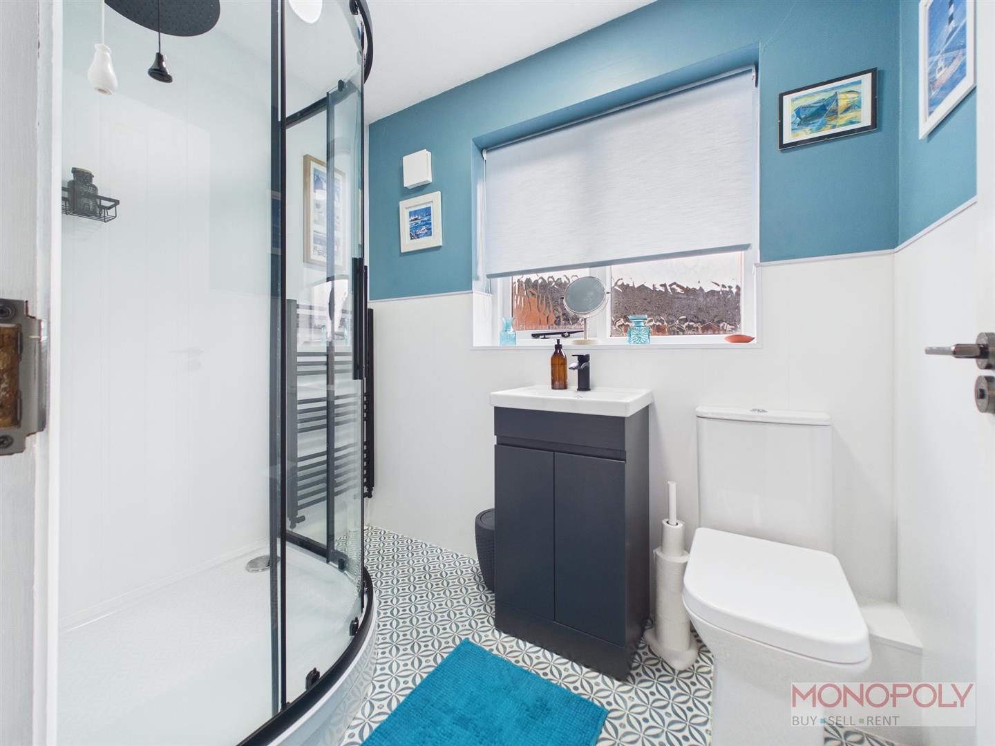 Modern three piece suite with black finishings comprising low-level WC, wash hand basin with vanity storage under and enclosed mains dual-hose shower cubical. Finished with heated towel rail, felt-back vinyl flooring, ceiling light point, extractor wooden double glazed frosted window to the rear elevation.