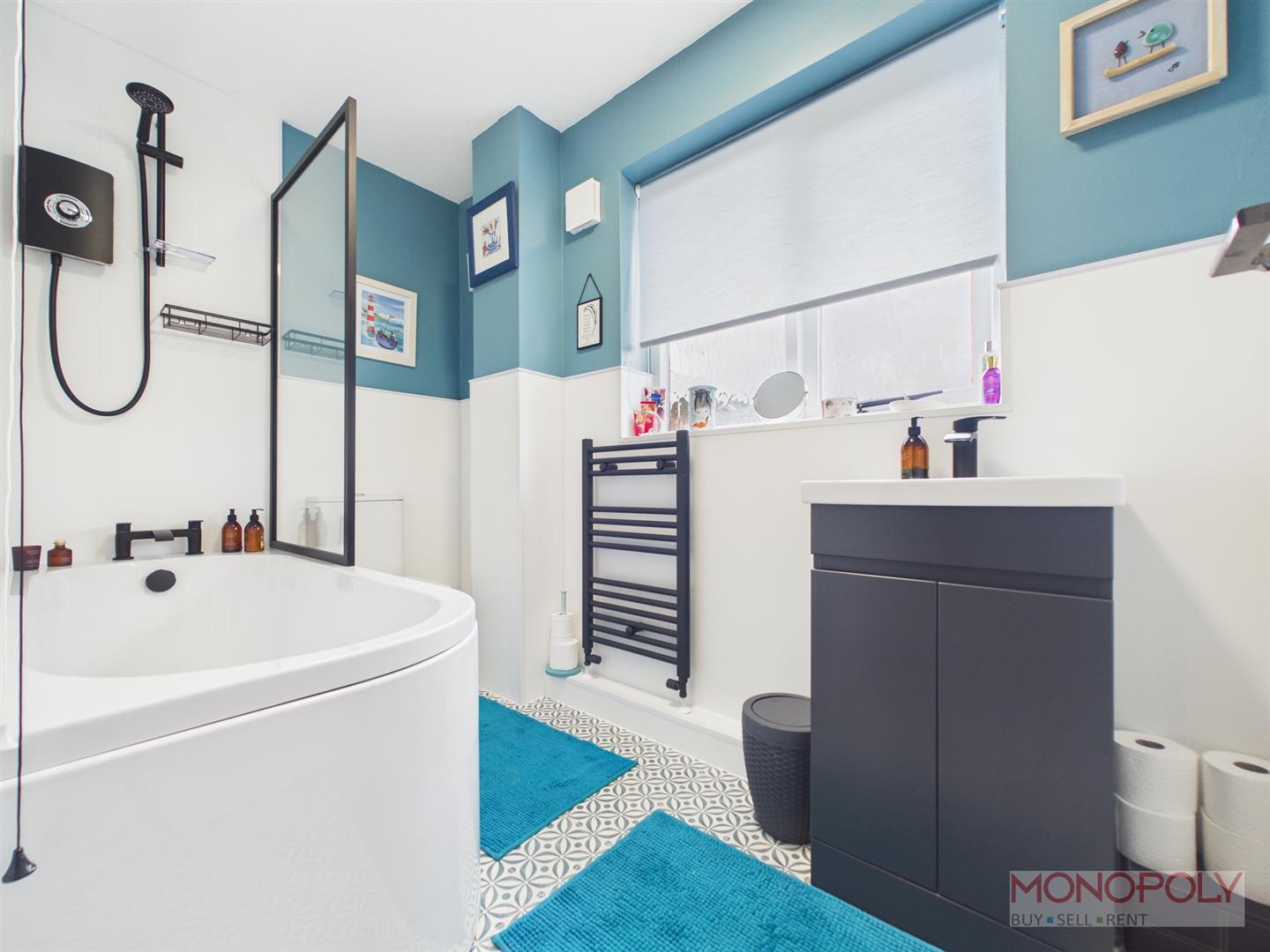 Modern three piece suite with black finishings comprising of a low-level WC, wash hand basin set on a vanity storage unit and panelled bath with electric shower over. Heated towel rail, felt-back vinyl flooring, extractor and wooden double glazed frosted window to the rear elevation.