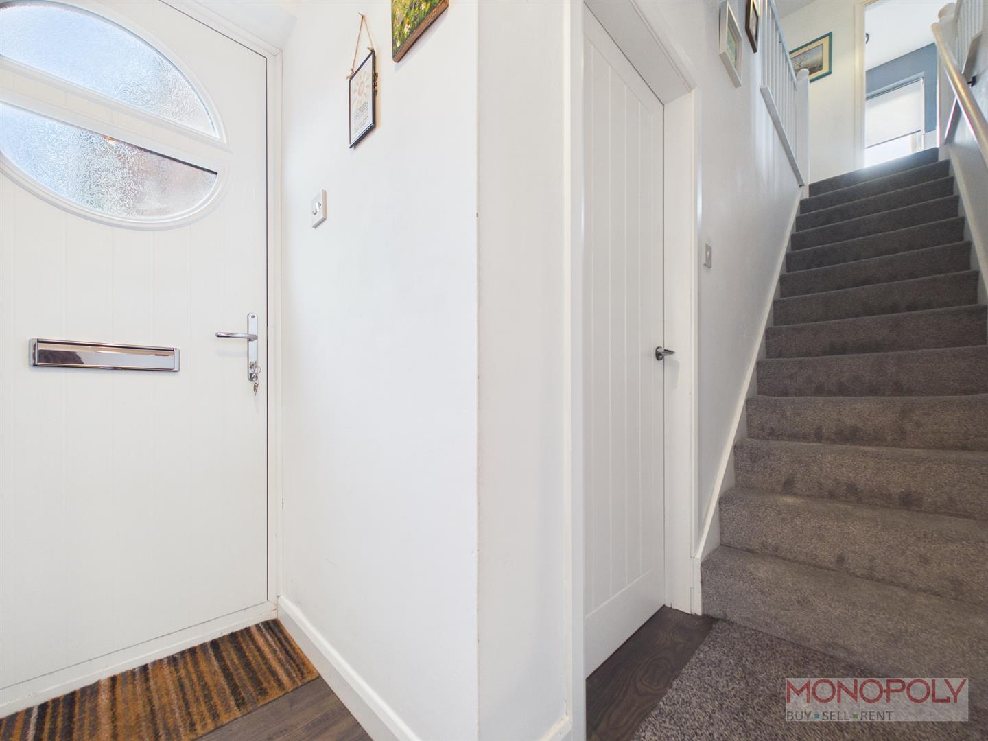 Composite door leading to the entrance hallway with wooden laminate flooring, panelled radiator, ceiling light point, stairs to first floor and engineered oak doors into downstairs WC, Kitchen/Dining and Living Area.