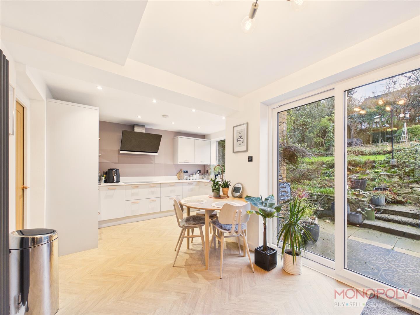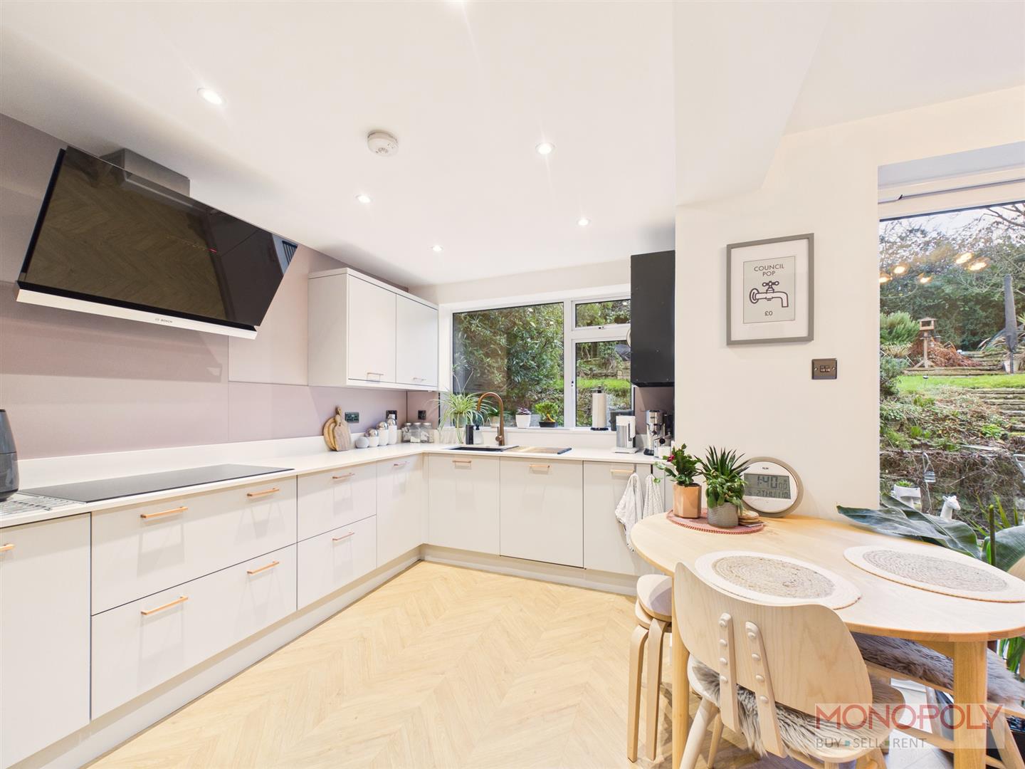 A contemporary kitchen housing a range of wall, drawer and base units with complimentary worktop over, incorporating a 1.5 composite sink unit. A range of modern integrated appliances to include eye-level 'BOSCH' built-in oven and oven-microwave combo, induction hob with modern tilted extractor over and dishwasher. Wood effect parquet style flooring, uPVC double glazed window to the rear and door into the utility. Additional dining space with space for a dining table and fridge freezer and extra worktop space with wall and base units. UPVC sliding doors to the rear garden, modern full length radiator, recessed LED lighting throughout and door into the dining room.