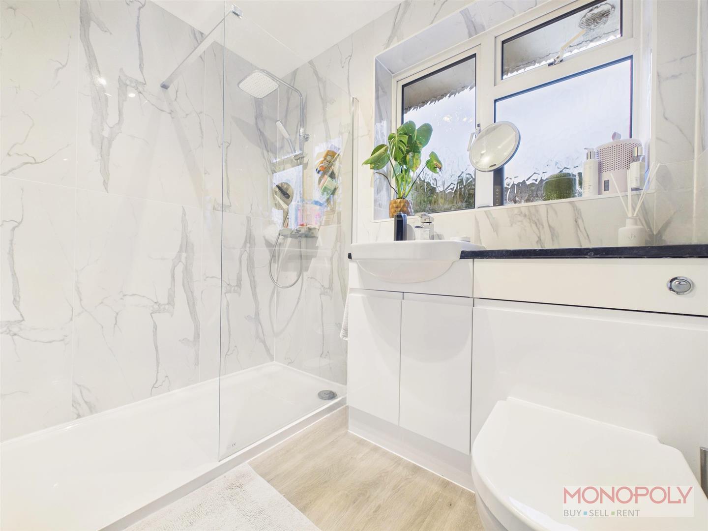 A modern three-piece suite housing a low-level w.c and hand wash basin set in a combination vanity unit and double walk-in shower with rainfall shower head over and shower attachment. Fully tiled walls, wood effect flooring, ceiling light point, heated towel rail and extractor fan. UPVC double glazed window to the rear elevation.